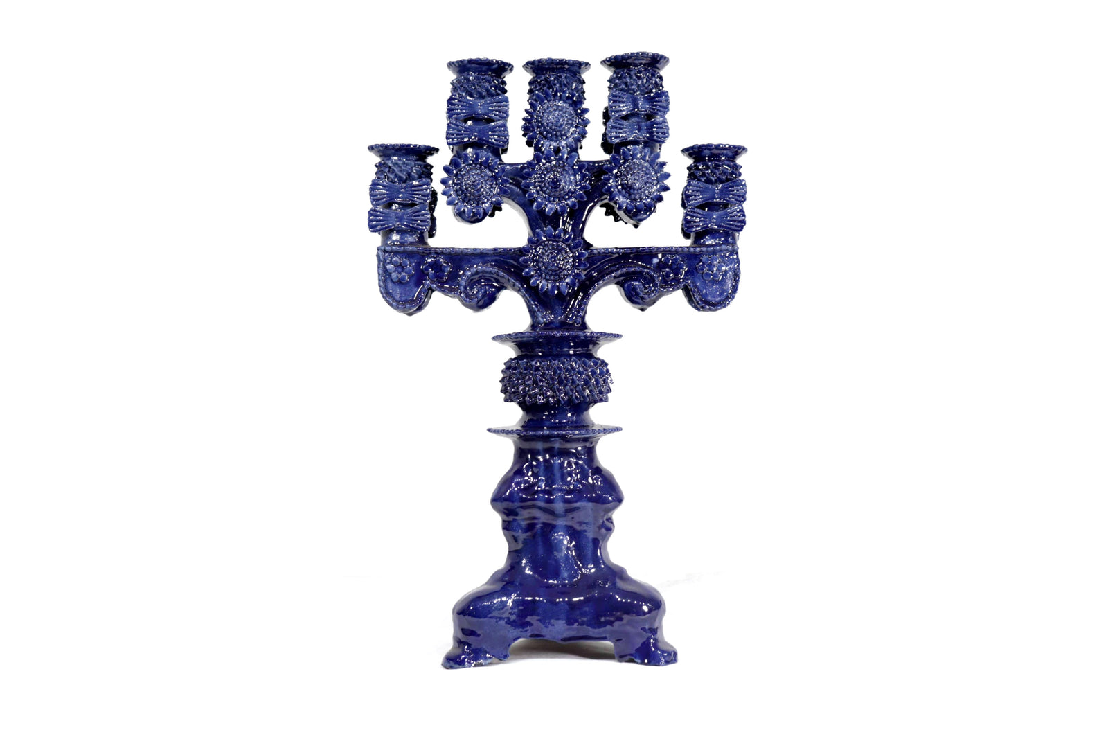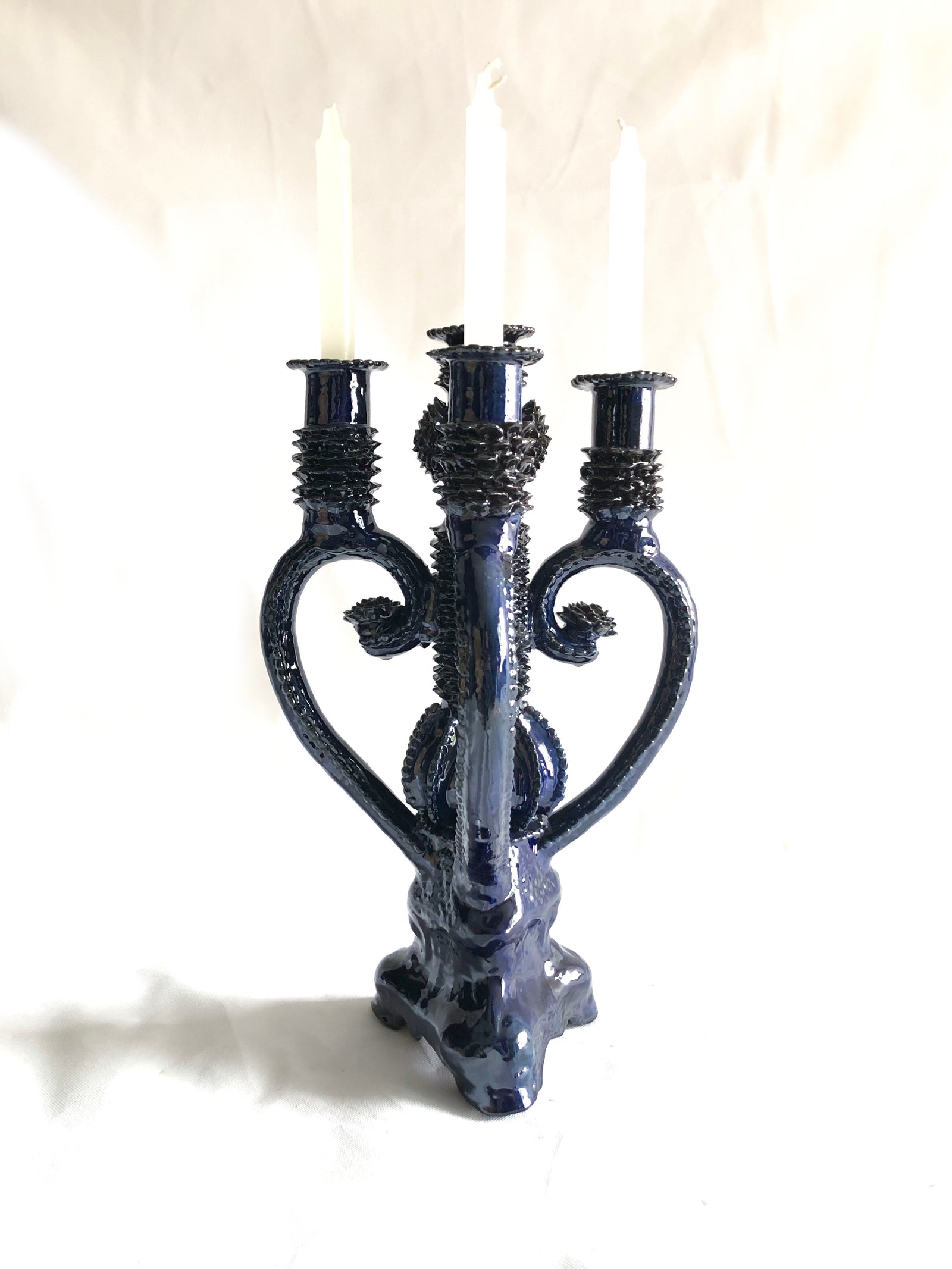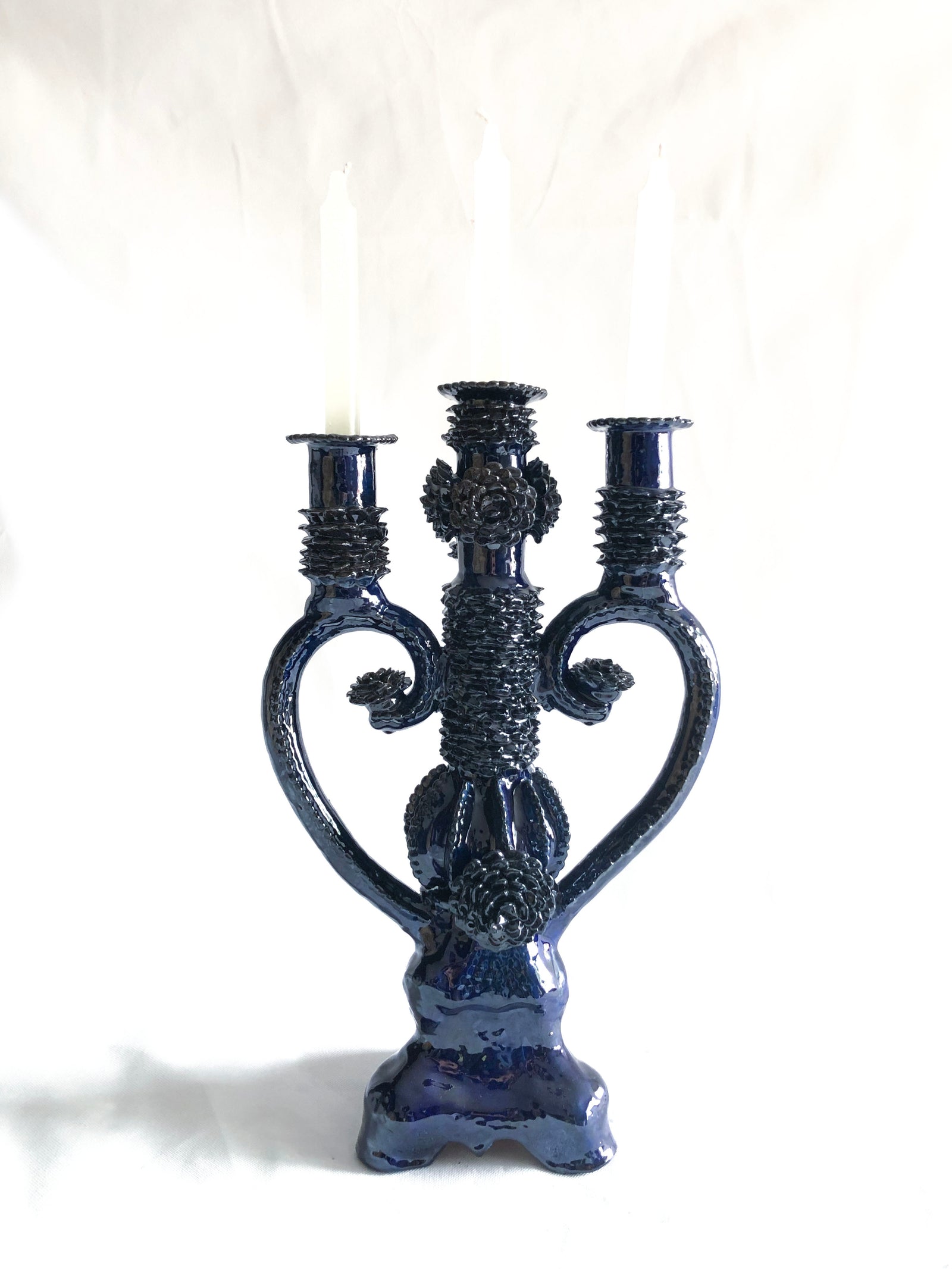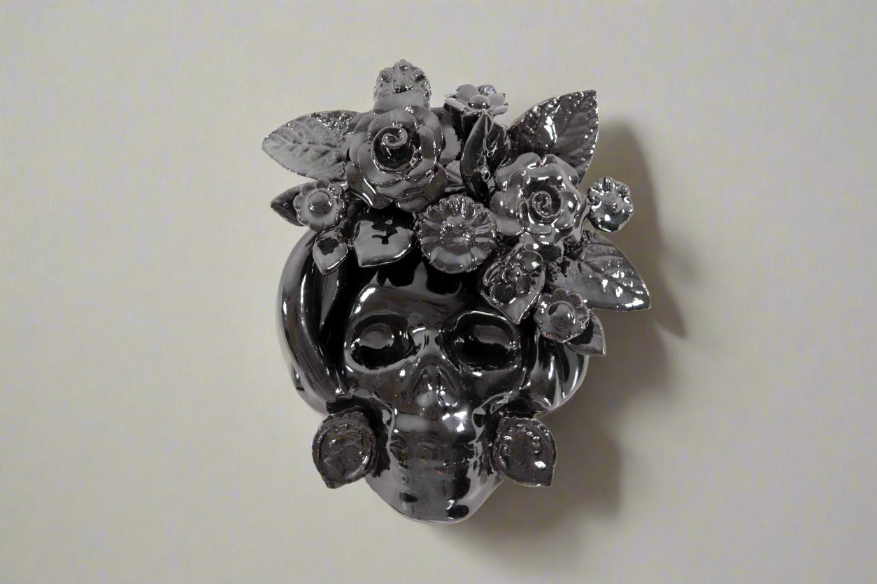 Candelero de calavera estilo Catrina hecha por artesanos especializados en el arte en barro de la comunidad de Capula, Morelia, Michoacán.