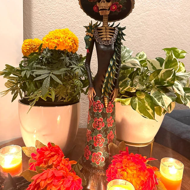 ¡Esta Katrina es una de las más impresionantes de mi colección! Estoy encantada con esta compra y espero pedir otra pronto. La artesanía es exquisita, el empaque fue excepcional y llegó rapidísimo desde México y en excelentes condiciones. ¡Es perfecta! Cualquiera que coleccione estas hermosas damas debería considerar seriamente a esta artista. ¡Es perfecta en todos los sentidos! ¡Ojalá pudiera darle a esta tienda más de cinco estrellas!