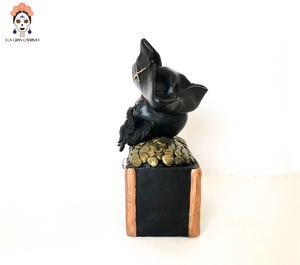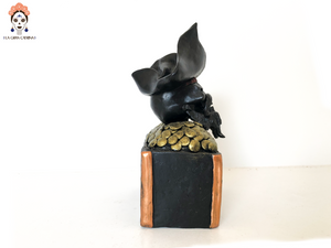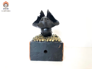 Cabeza de pirata en cofre estilo Catrina hecha por artesanos especializados en el arte en barro de la comunidad de Capula, Morelia, Michoacán.