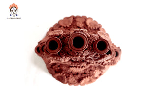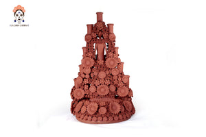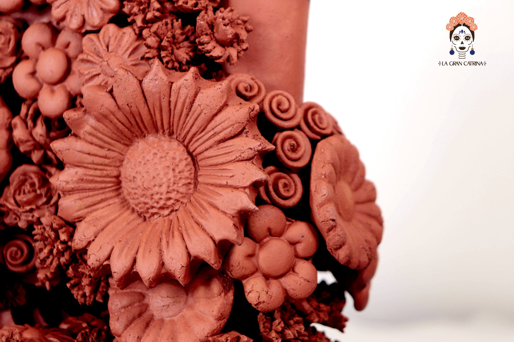 La pieza presenta una poderosa Calavera Mexicana en la cima, rodeada por una espectacular torre de detalladas flores de Cempasúchil (Marigold). Su forma piramidal y su acabado mate en cerámica negra la convierten en un objeto ideal para tu hogar.