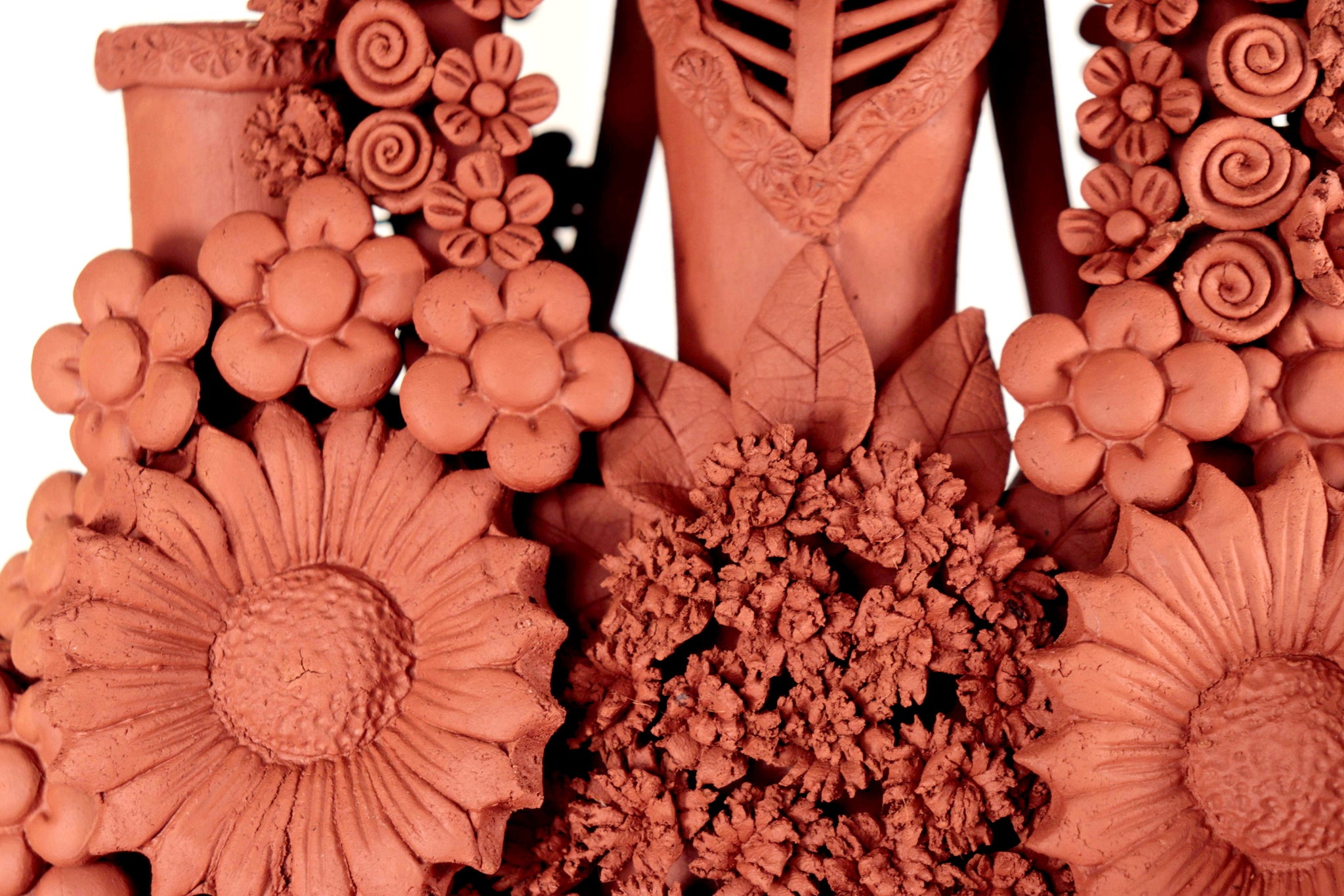 Añada una pieza central impactante a su colección con esta escultura de barro única. Inspirada en la rica tradición del Día de Muertos mexicano, esta obra de arte popular mexicano fusiona la iconografía de la muerte y la vida.