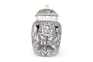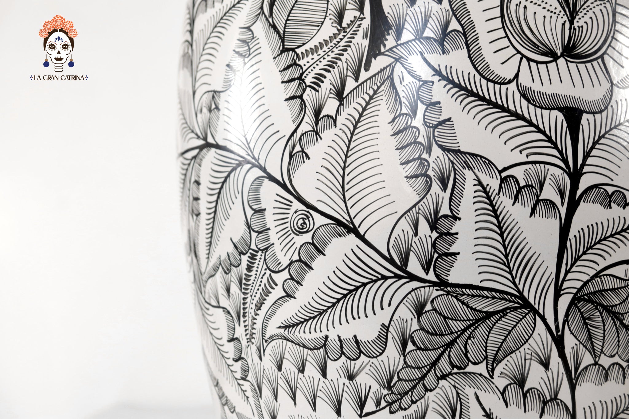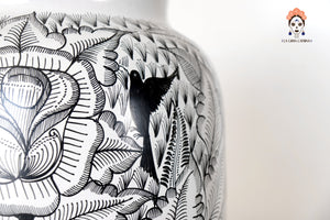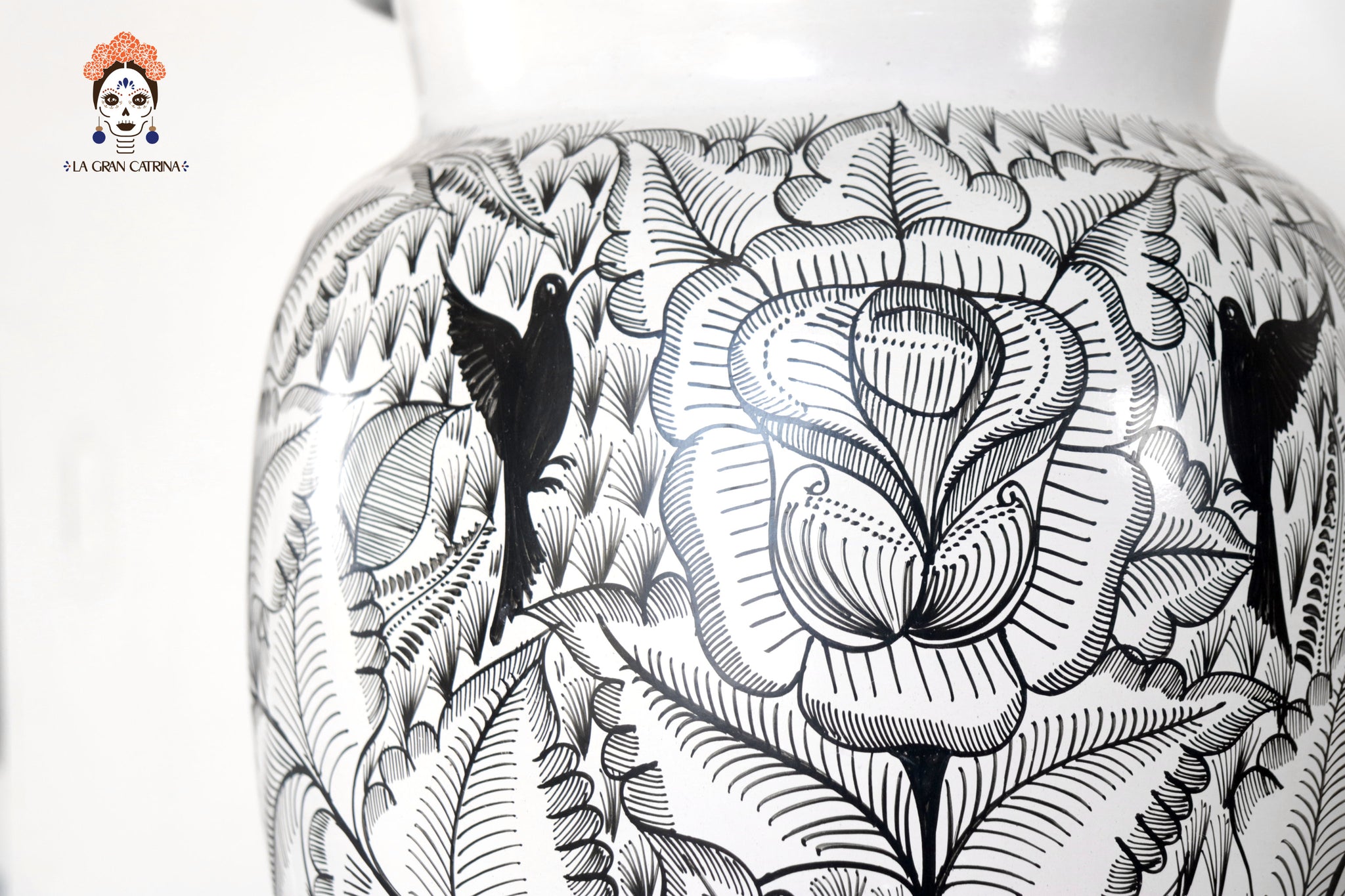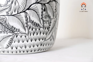 Esta olla artesanal de barro blanco es una pieza representativa de la alfarería tradicional mexicana, elaborada completamente a mano y decorada con un minucioso grabado artístico en negro. Su diseño presenta motivos florales, aves y formas orgánicas que recorren toda la superficie, creando una composición visual rica y equilibrada.