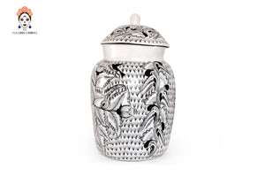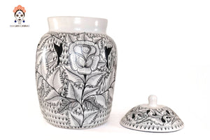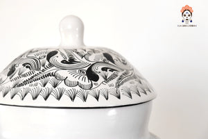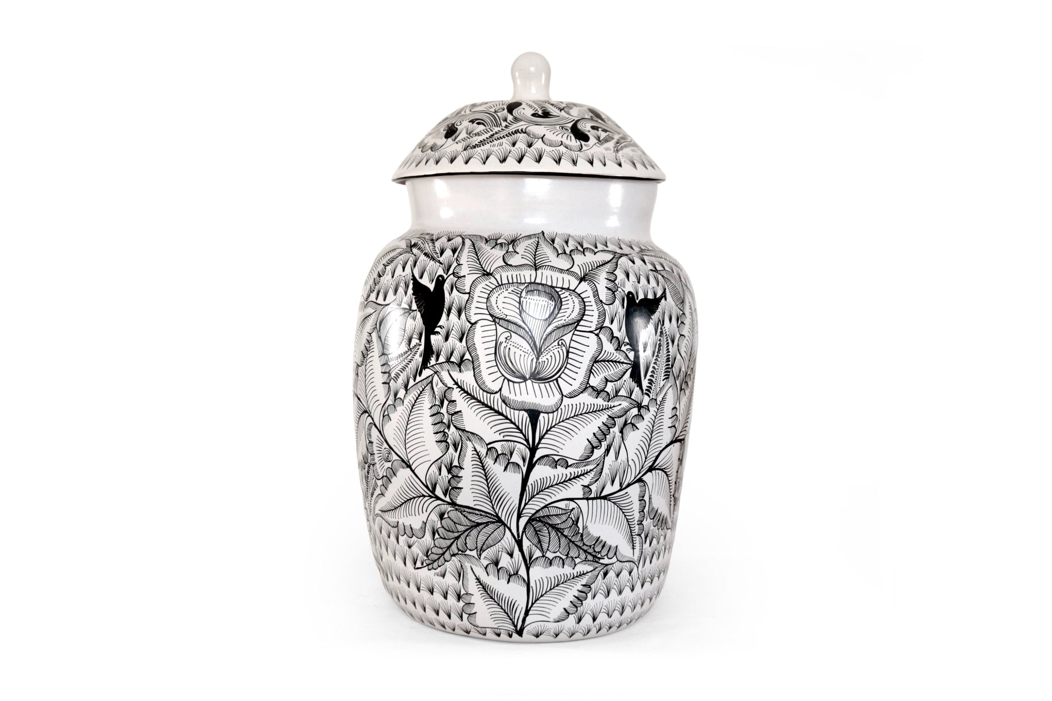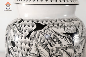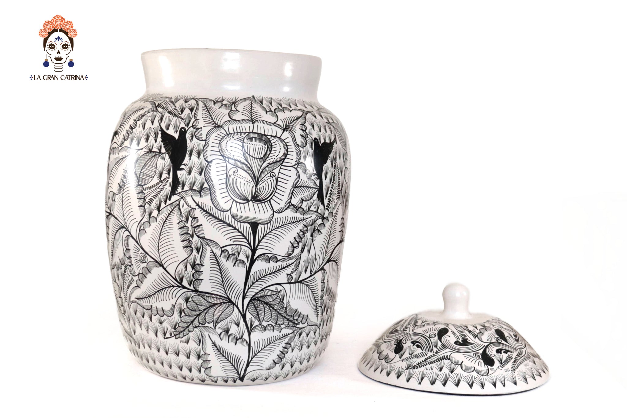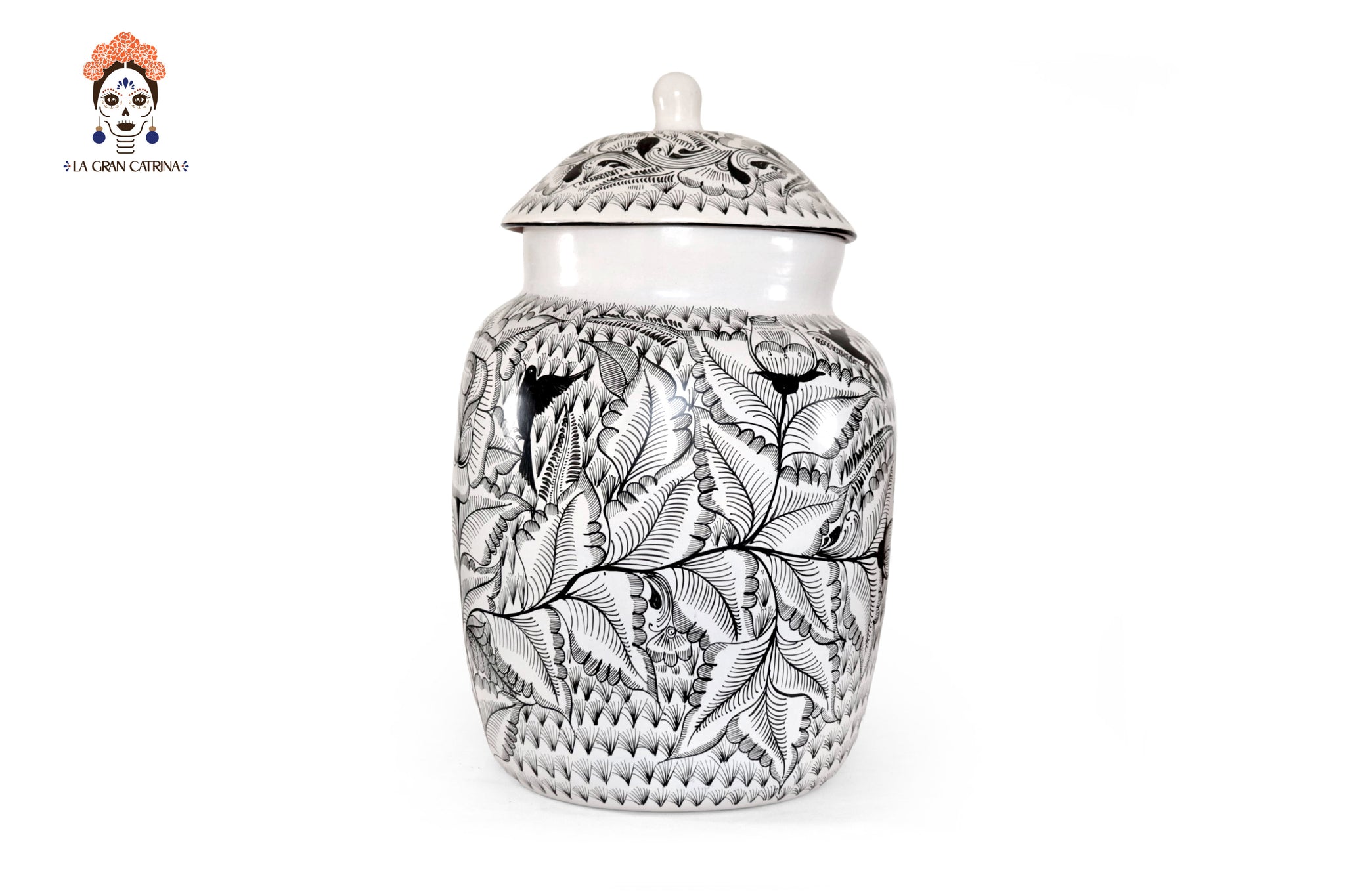 Cuenta con tapa integrada, lo que la convierte en una pieza funcional y decorativa a la vez. El contraste entre el fondo claro del barro y el grabado oscuro resalta el trabajo detallado del artesano, reflejando técnicas transmitidas de generación en generación.