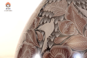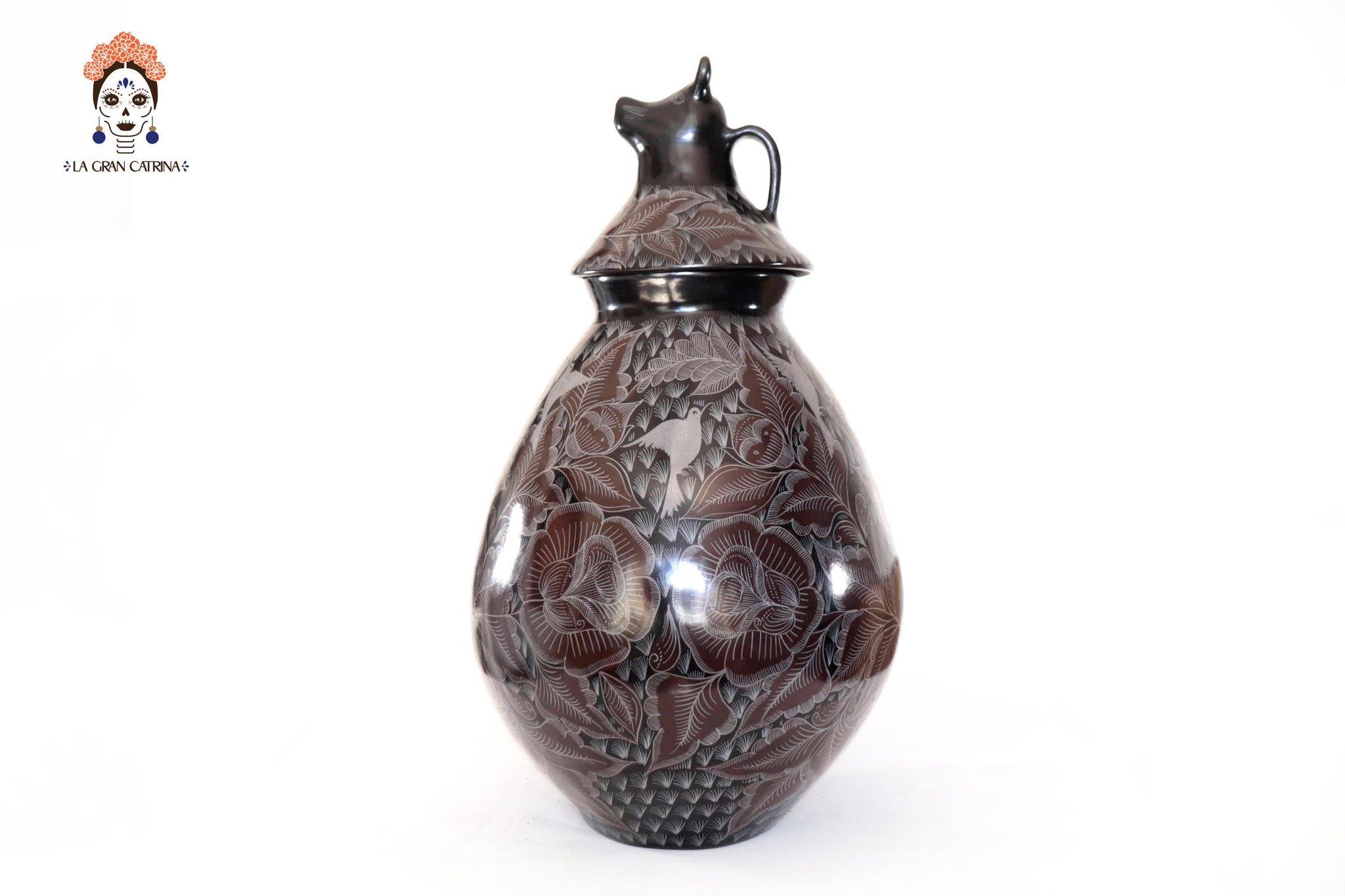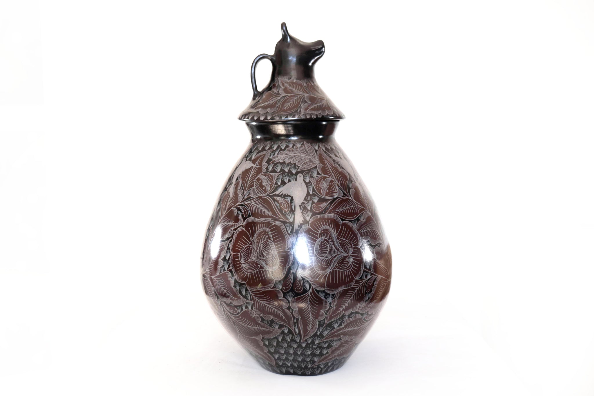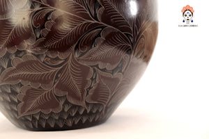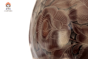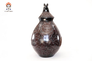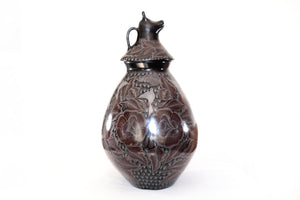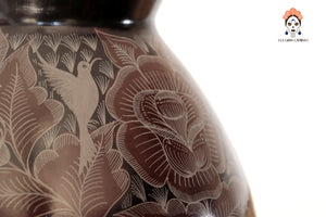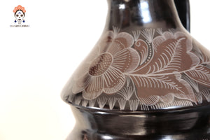 La superficie está finamente grabada a mano con motivos florales y aves, destacando el dominio técnico del artesano y el valor artístico de la pieza. El característico acabado negro profundo se obtiene a través del proceso de bruñido y una cocción controlada, logrando un brillo elegante y natural.