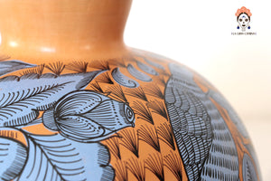 Este jarrón de cerámica tradicional de Huancito está cubierto por un delicado entramado de aves y hojas que se despliegan en ritmo continuo alrededor de la pieza. Los tonos azules, profundos y serenos, contrastan con la calidez del barro natural, creando una composición viva y equilibrada.