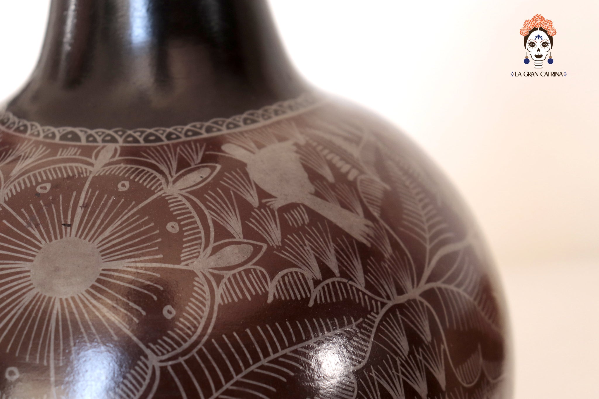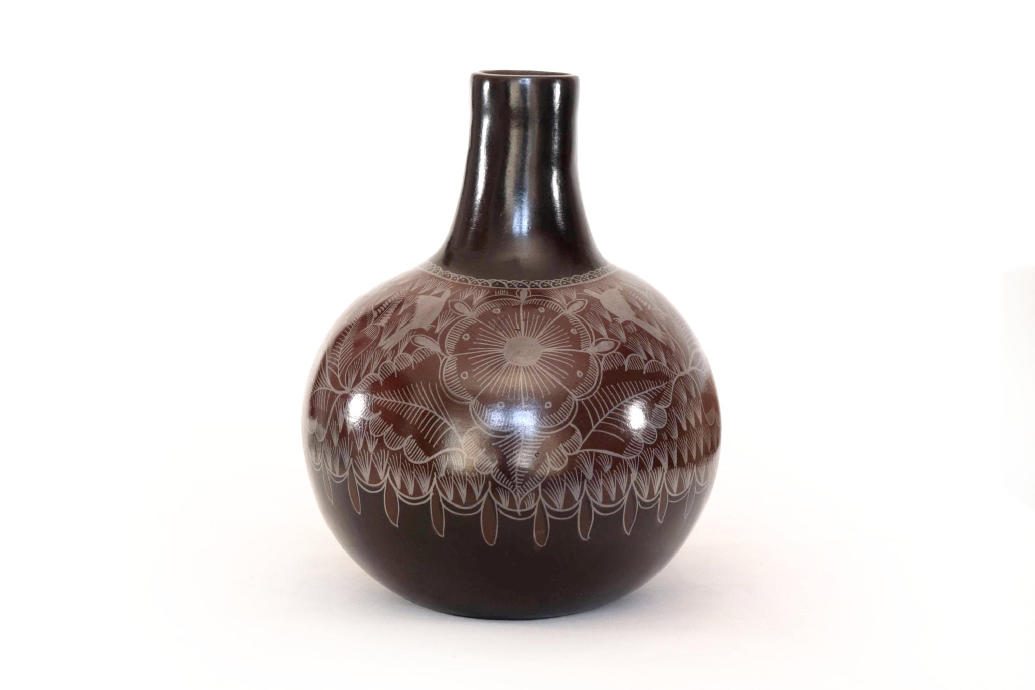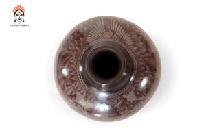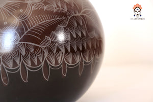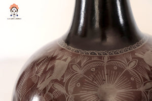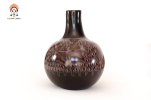 Jarrón artesanal de Huancito en tono café profundo, decorado con delicados grabados florales hechos a mano. Su cuello oscuro y acabado mate evocan la fuerza de la tierra y la calma del barro ancestral. Una pieza sobria y elegante que aporta carácter y calidez a cualquier espacio.