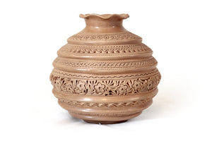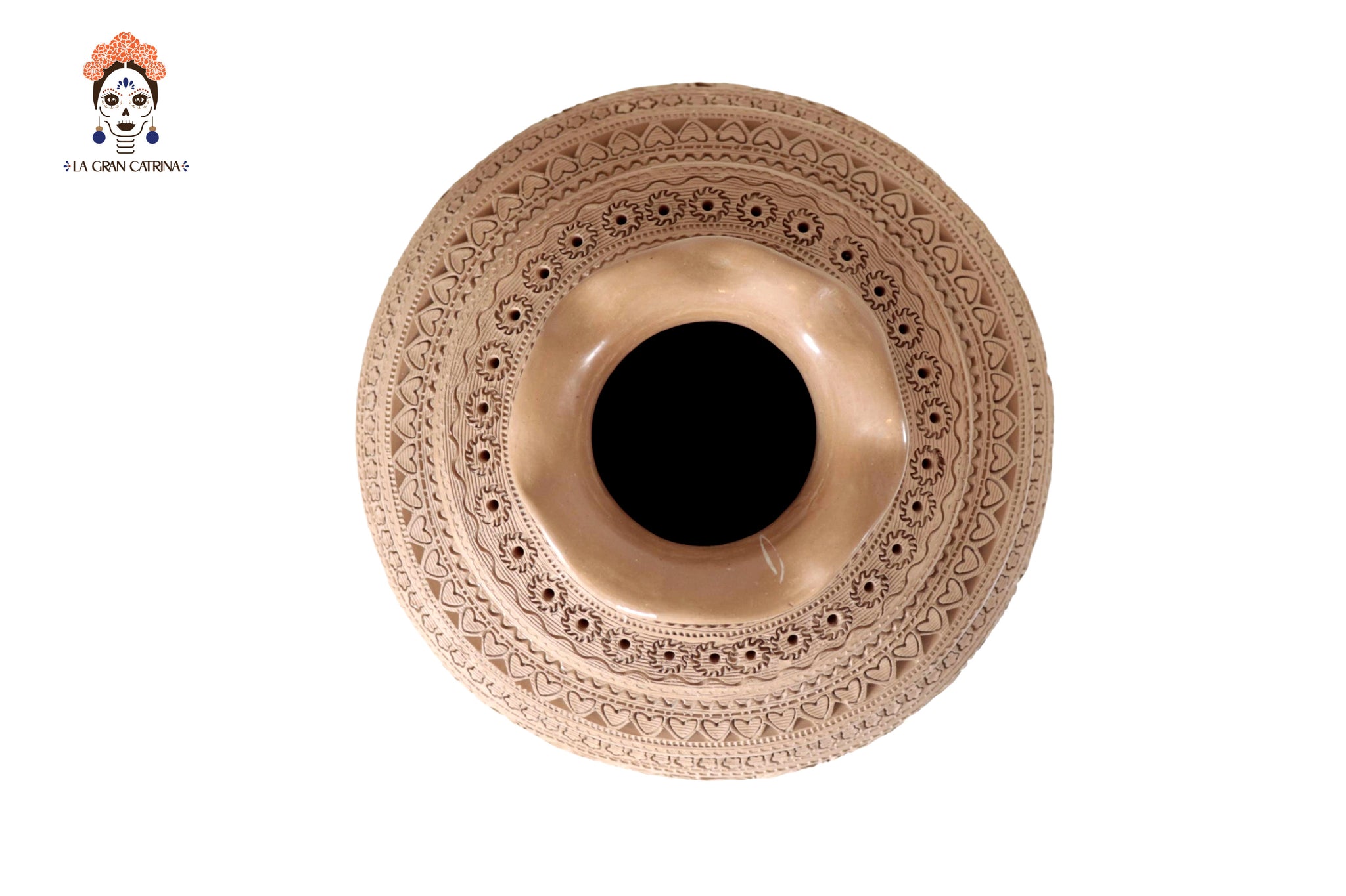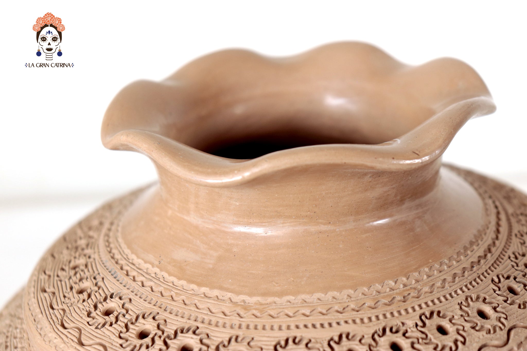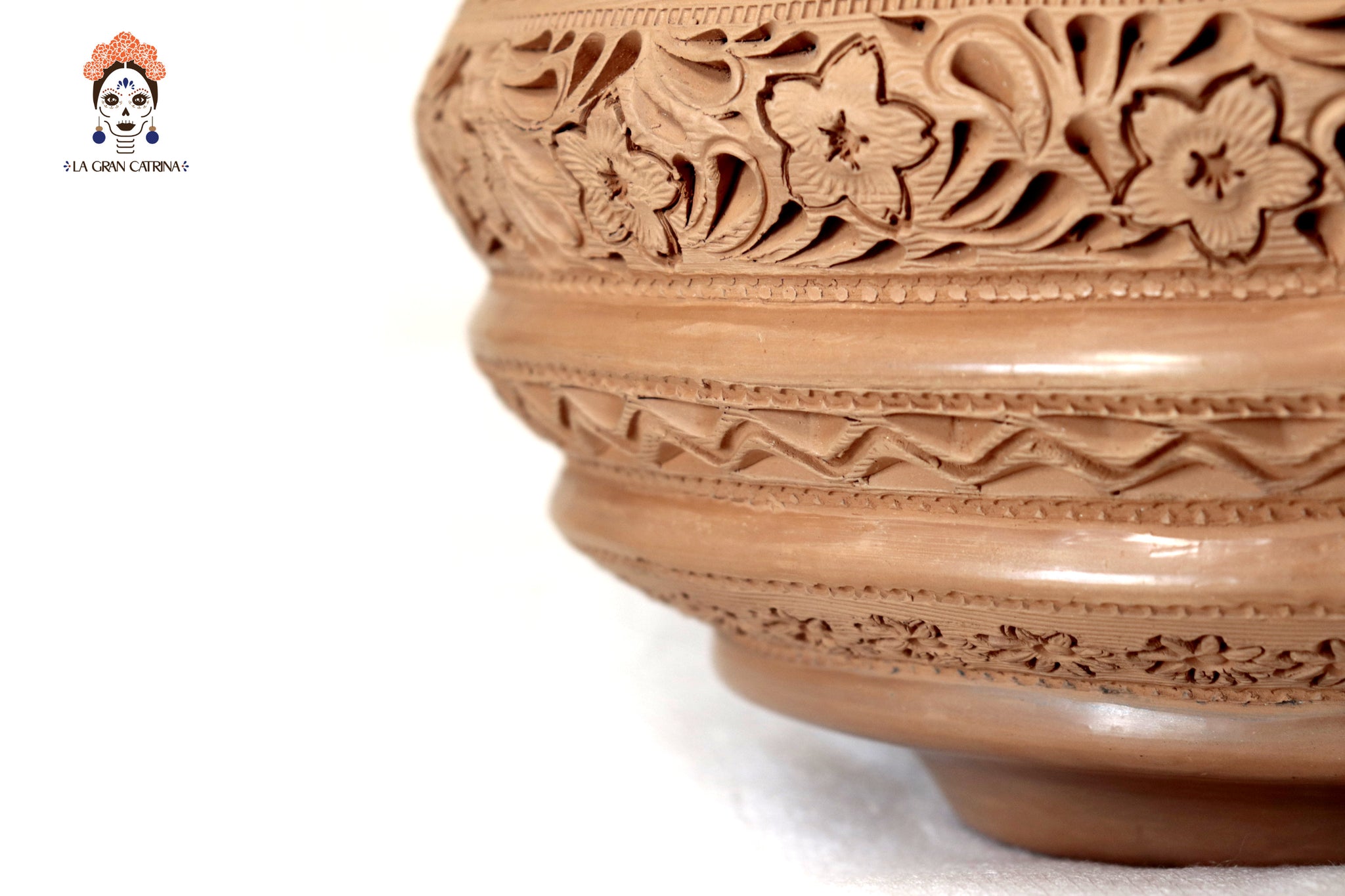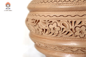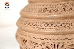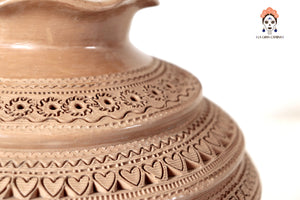 Jarrón elaborado a mano por artesanos de San Bartolo, utilizando técnicas tradicionales transmitidas por generaciones. Esta pieza está modelada en barro natural y decorada con finos grabados geométricos y motivos simbólicos que recorren todo el cuerpo, creando una textura rica en detalle y profundidad visual.