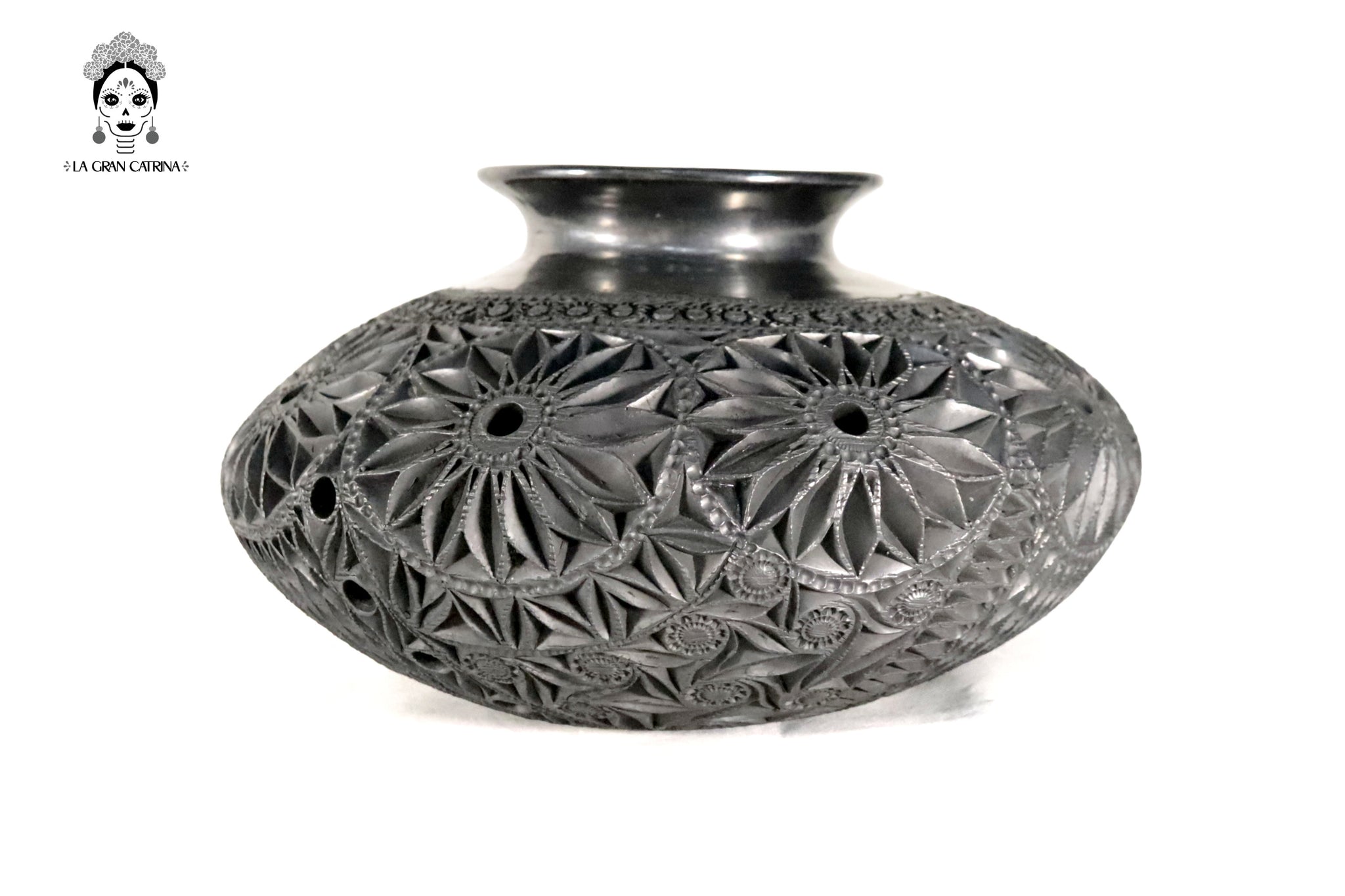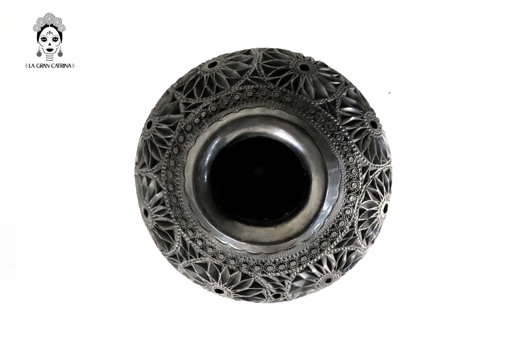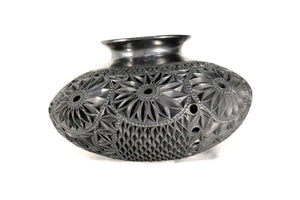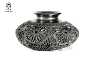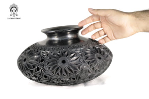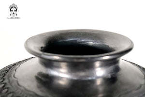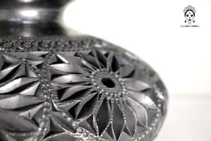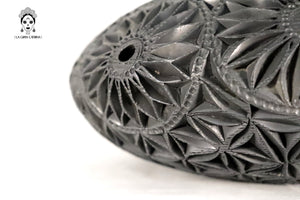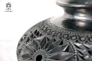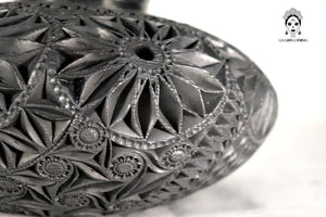 Este jarrón de barro negro oaxaqueño es una pieza artesanal elaborada mediante técnicas tradicionales y tallada completamente a mano. Su cuerpo esférico presenta un detallado trabajo en relieve con patrones circulares, espirales y formas orgánicas que aportan textura, profundidad y carácter.