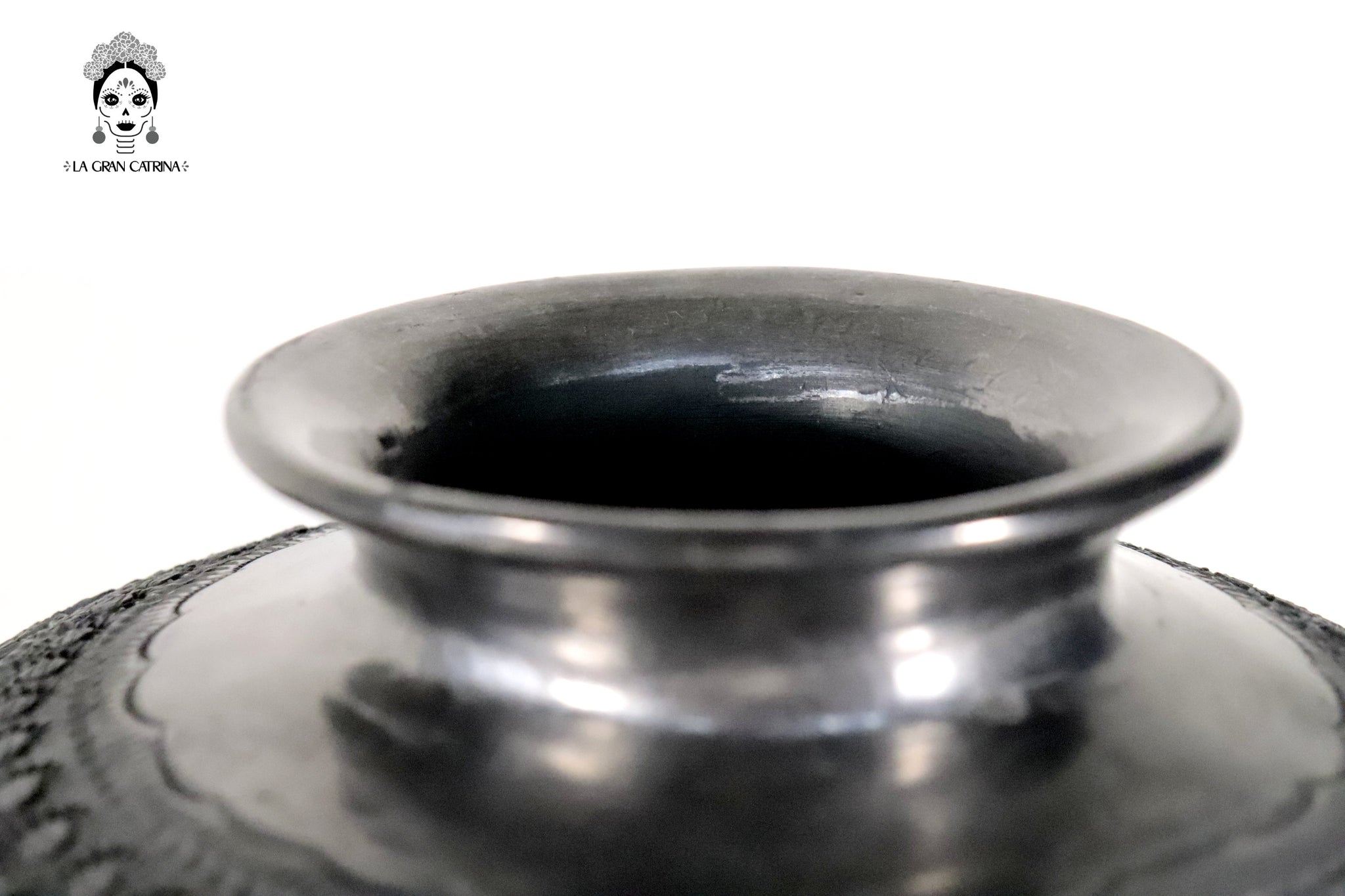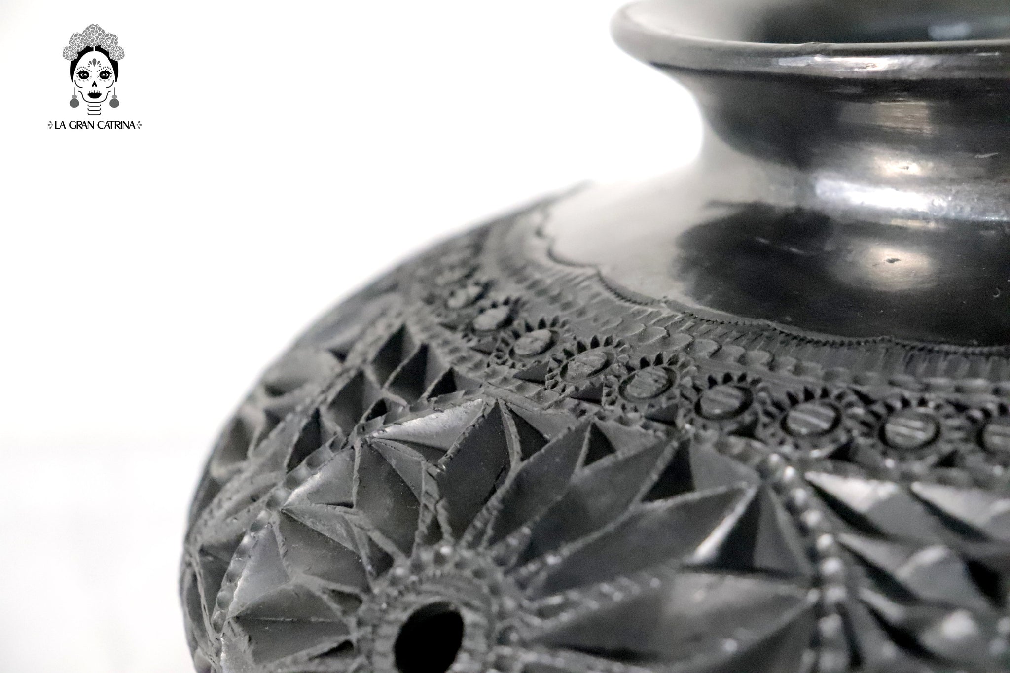 El acabado pulido resalta el tono oscuro característico del barro negro, generando un contraste natural entre las zonas lisas y las áreas talladas. Su forma compacta y equilibrada lo convierte en un elemento decorativo versátil para salas, recibidores, oficinas o espacios contemporáneos.