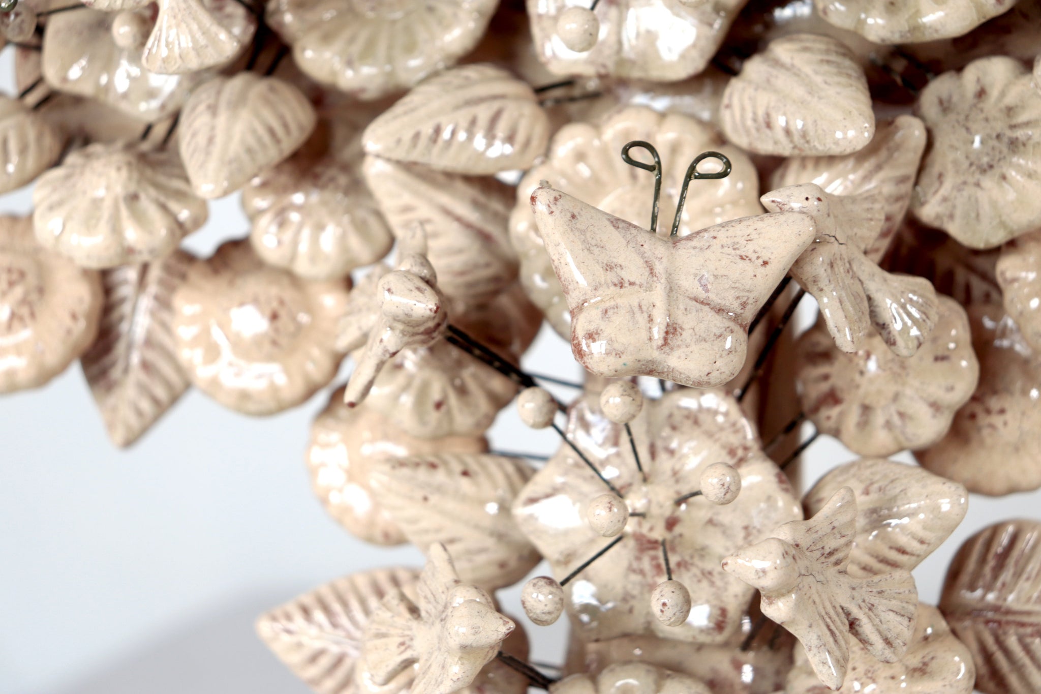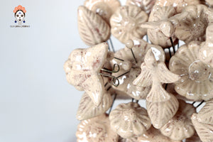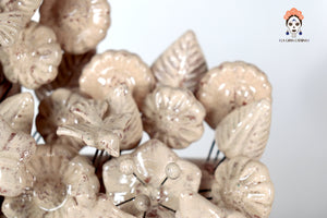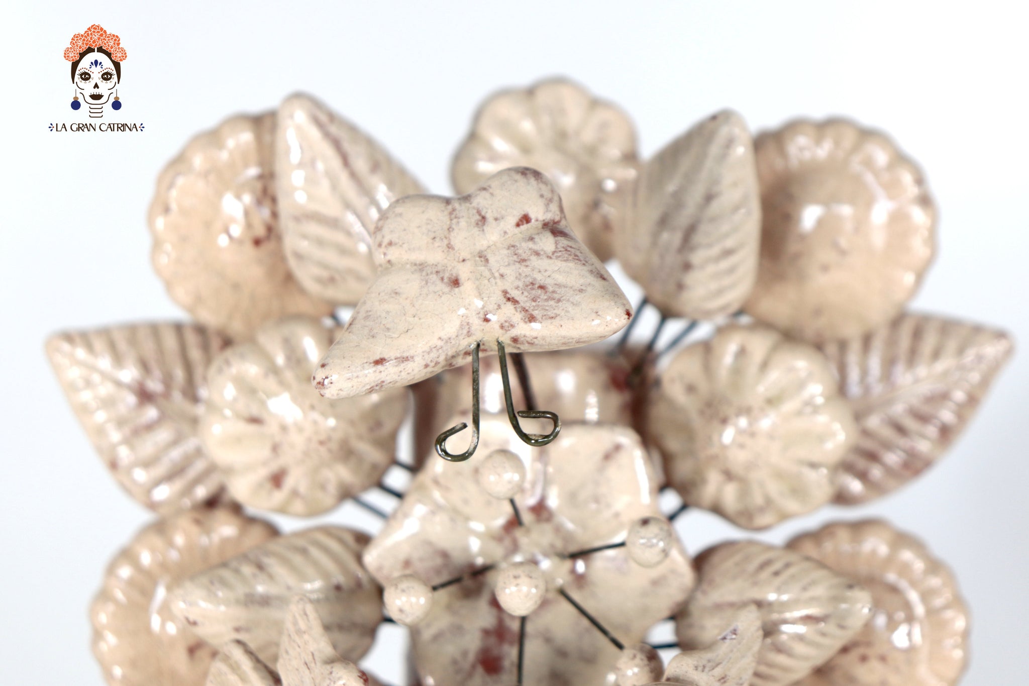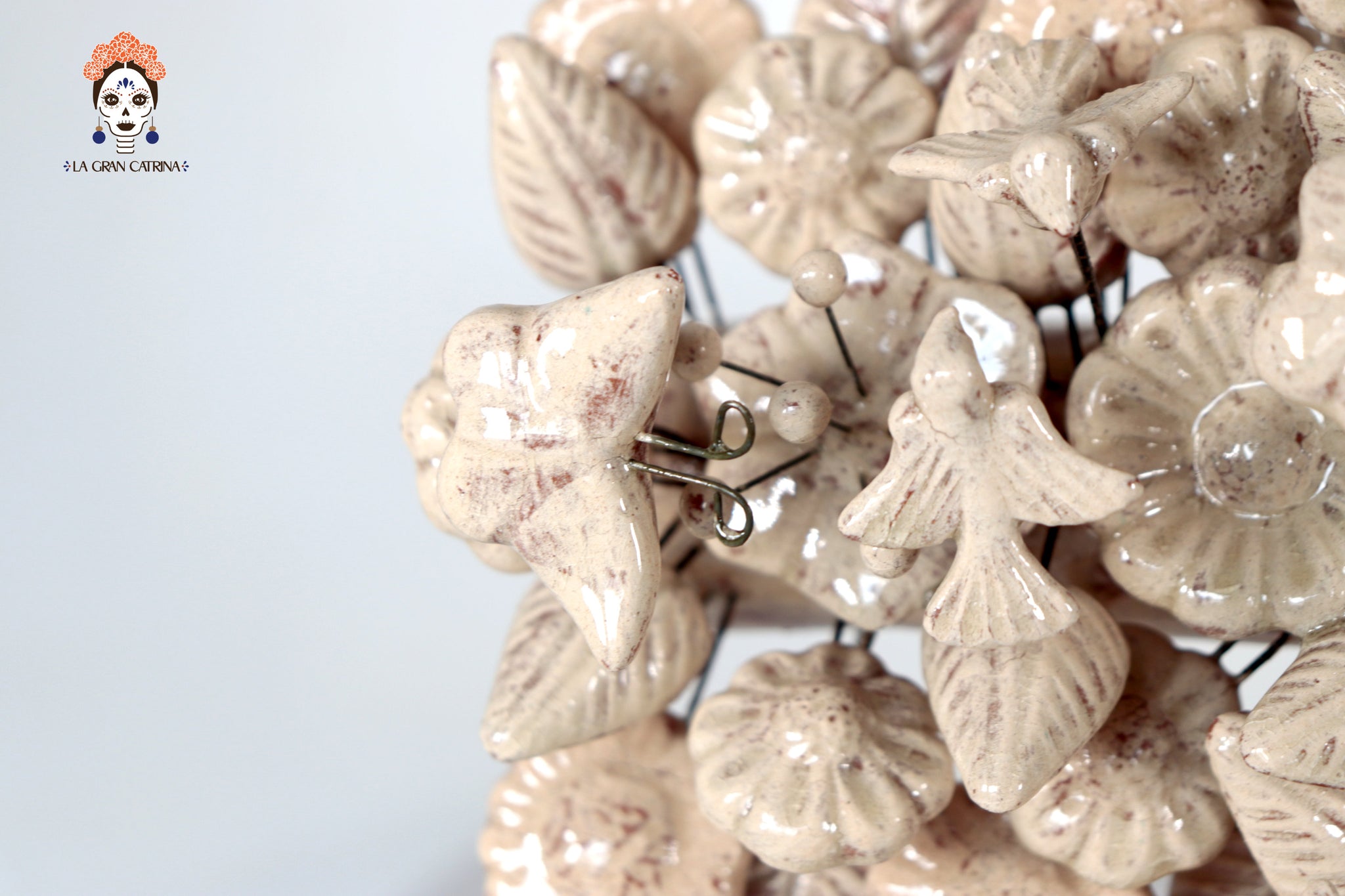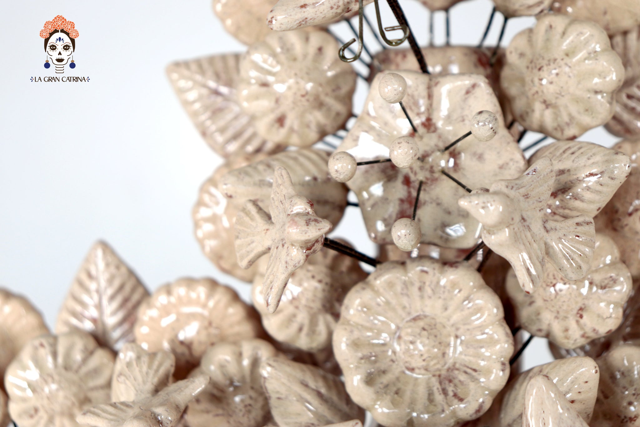 Cada elemento está modelado y ensamblado a mano, montado sobre finos alambres que le otorgan ligereza visual y volumen. El acabado vidriado aporta un toque contemporáneo a esta pieza profundamente arraigada en la cultura popular mexicana.