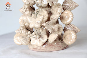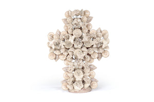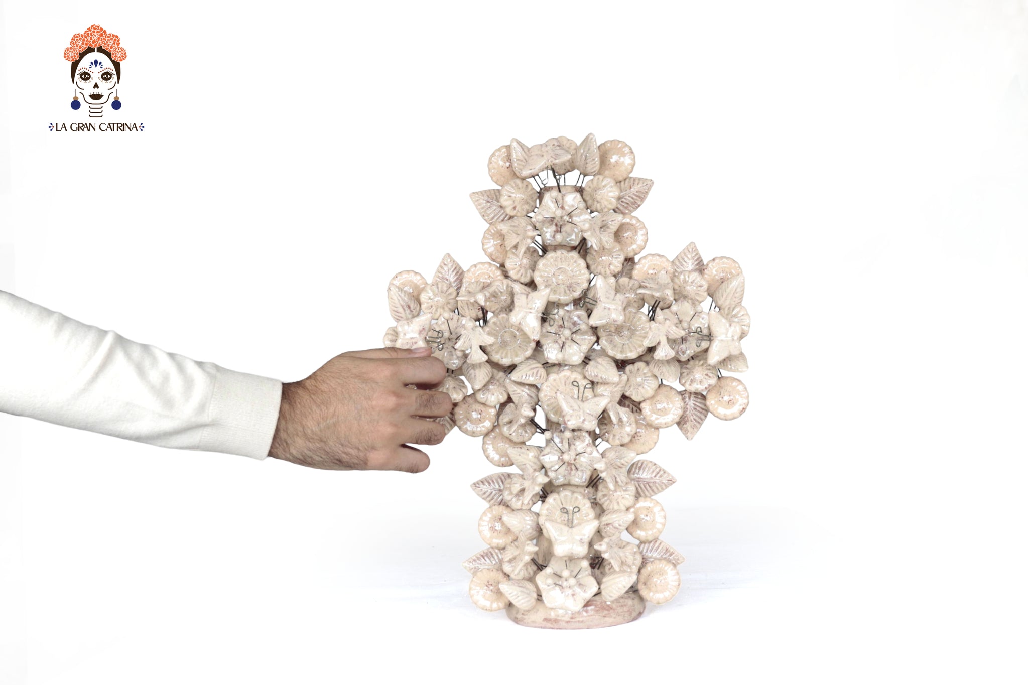 Cruz ornamental elaborada en barro cocido y cubierta con un esmalte blanco brillante que resalta cada detalle de su compleja composición. Esta pieza es un tributo a la tradición alfarera de Metepec, donde las formas florales, mariposas y hojas se entrelazan con armonía, creando una obra llena de simbolismo y belleza.