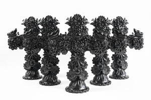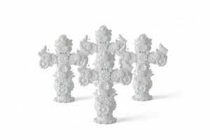Cruz decorativa elaborada en cerámica artesanal, con un diseño escultórico detallado compuesto por relieves florales y elementos ornamentales que realzan su riqueza visual. Cada pieza es hecha a mano, lo que aporta carácter único y autenticidad, convirtiéndola en un objeto decorativo ideal para hoteles, boutiques, concept stores, galerías, proyectos de interiorismo y regalos corporativos.