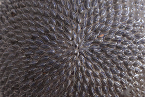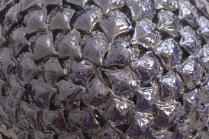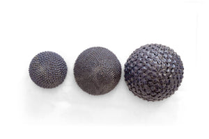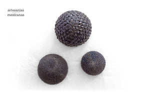 Las esferas, hechas de barro vidriado, presentan un diseño geométrico y delicado, que refleja la luz y crea un efecto visual único.