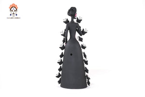 La Catrina es representada por la imagen de una calavera ataviada con un sombrero de plumas a la moda europea del siglo XIX.