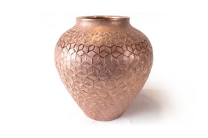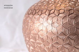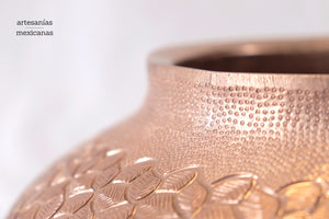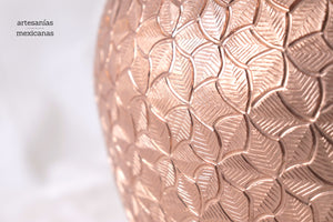 Esta pieza de cobre martillado que se origina en Santa Clara del Cobre, Michoacán, es una pieza representativa del arte y la habilidad de los artesanos locales. Hecho a mano mediante técnicas ancestrales, este jarrón presenta una superficie texturizada con patrones únicos que reflejan los golpes precisos y rítmicos del martillo. Cada detalle, desde los bordes curvos hasta el sutil embellecimiento de sus líneas, cuenta la historia de tradición, paciencia y creatividad, haciendo de cada pieza un objeto no solo decorativo, sino también de profunda herencia cultural.