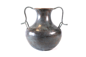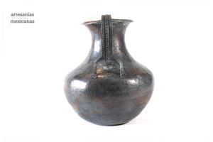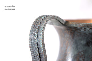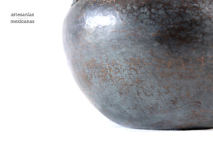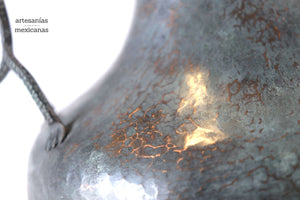 Esta pieza de cobre martillado que se origina en Santa Clara del Cobre, Michoacán, es una pieza representativa del arte y la habilidad de los artesanos locales. Hecho a mano mediante técnicas ancestrales, este jarrón presenta una superficie texturizada con patrones únicos que reflejan los golpes precisos y rítmicos del martillo. Cada detalle, desde los bordes curvos hasta el sutil embellecimiento de sus líneas, cuenta la historia de tradición, paciencia y creatividad, haciendo de cada pieza un objeto no solo decorativo, sino también de profunda herencia cultural.