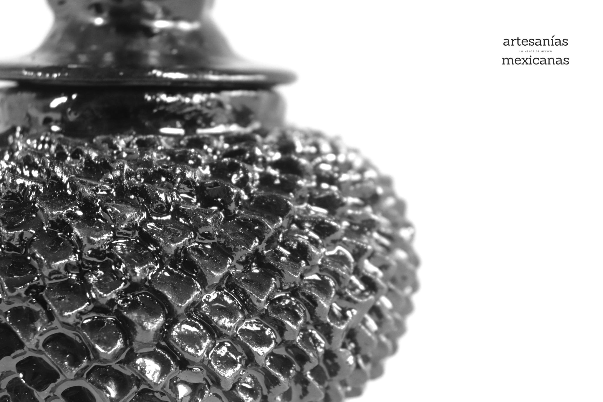 Una pieza artesanal que fusiona el simbolismo tradicional de la piña con un diseño moderno y audaz. Elaborada en cerámica y pintada a mano, esta piña en tono negro intenso destaca por su textura de picos, que crea un juego de luces y sombras lleno de profundidad. Su tamaño compacto la hace perfecta para espacios pequeños, añadiendo un toque de elegancia y autenticidad.