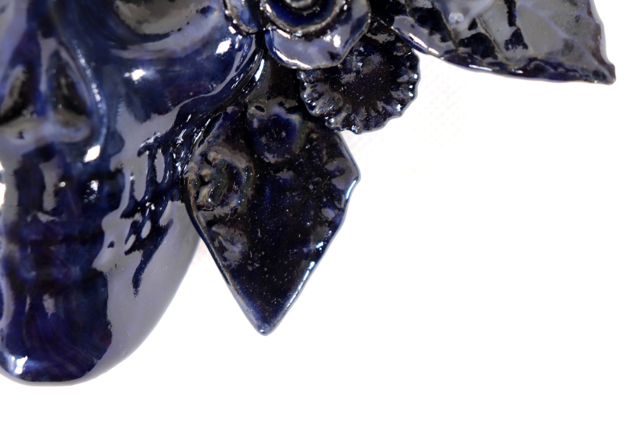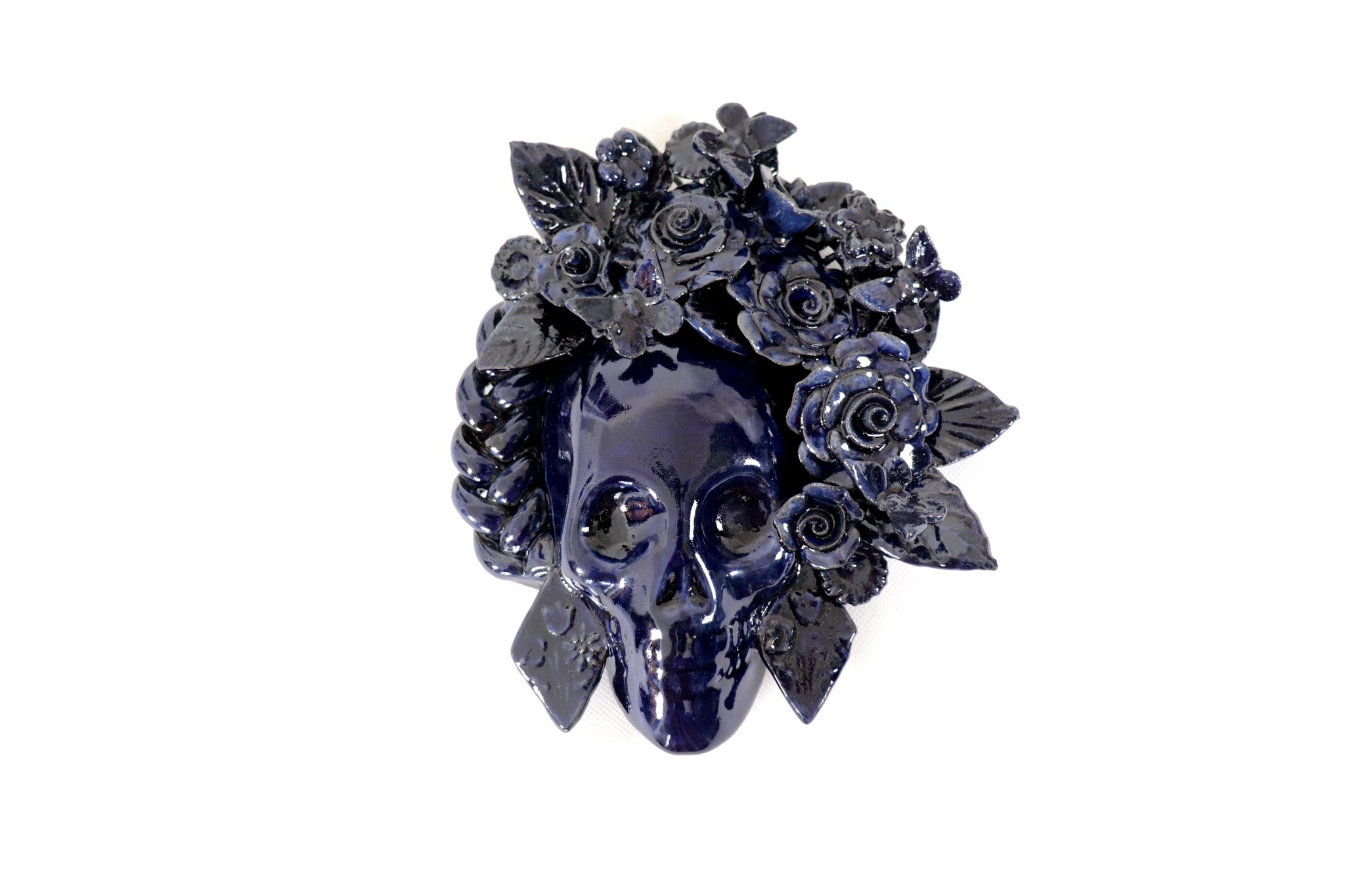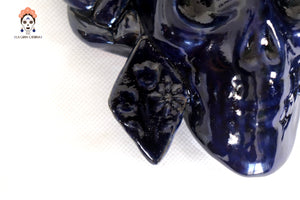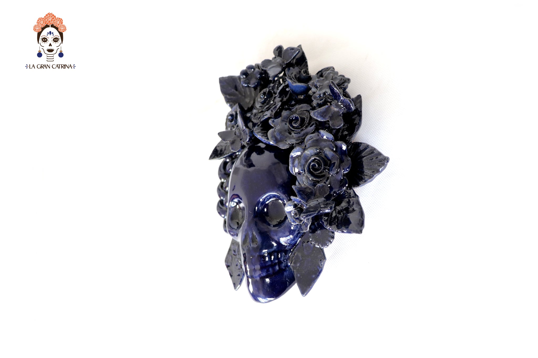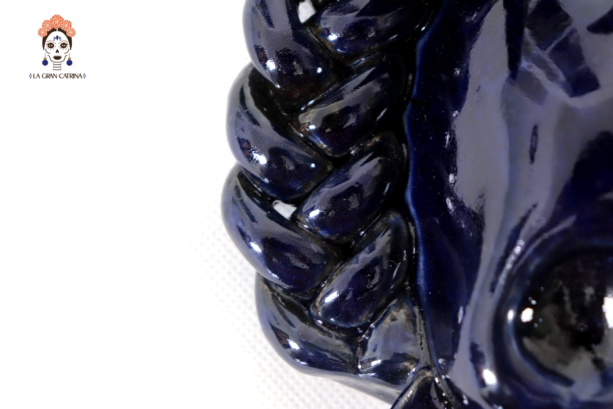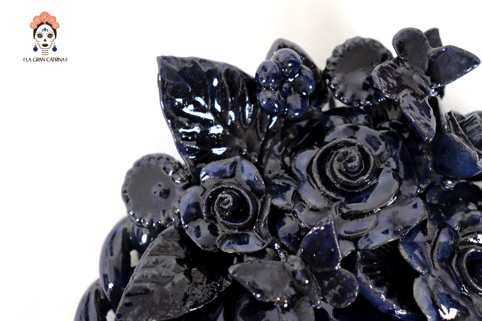 La calavera, pintada a mano sobre barro cerámico, presenta un diseño delicado y preciso, que nos invita a reflexionar sobre la vida y la muerte. Cada rasgo es un homenaje al arte y la tradición mexicanos, que nos permiten celebrar la vida y la muerte de manera respetuosa y digna.