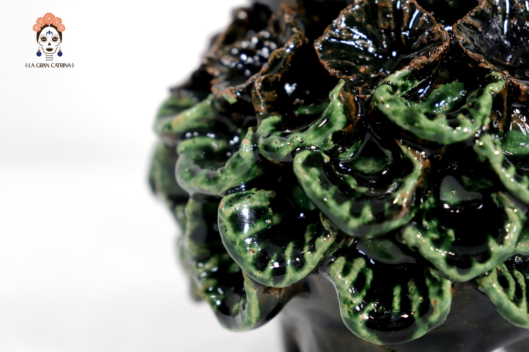 Las piñas de barro vidriado del municipio de Tangancícuaro son artesanías muy llamativas normalmente usadas como grandes o pequeños adornos en los hogares o haciendas de México, EEUU y otros países.