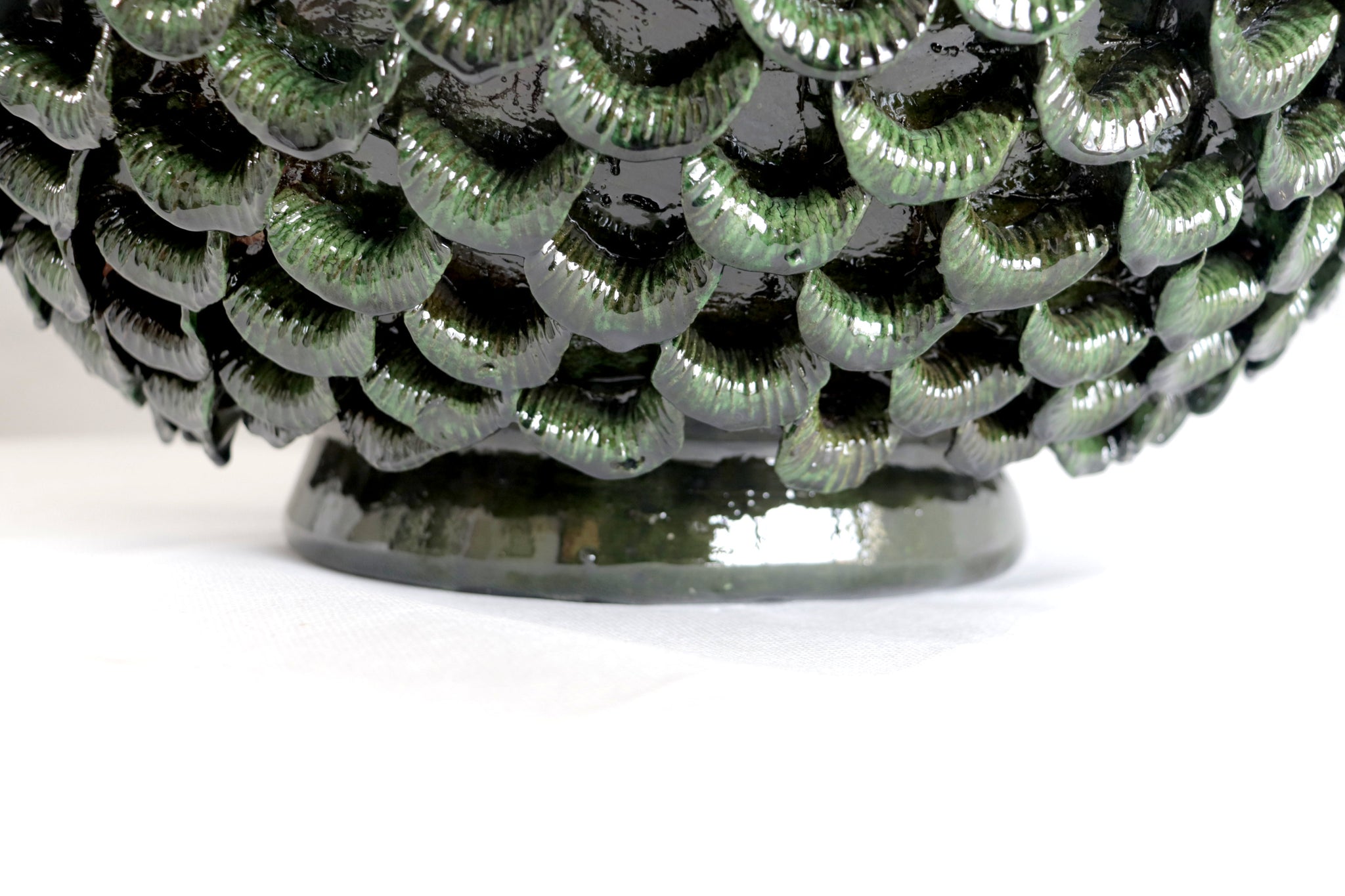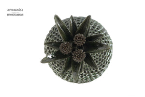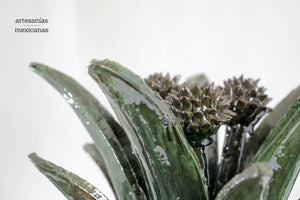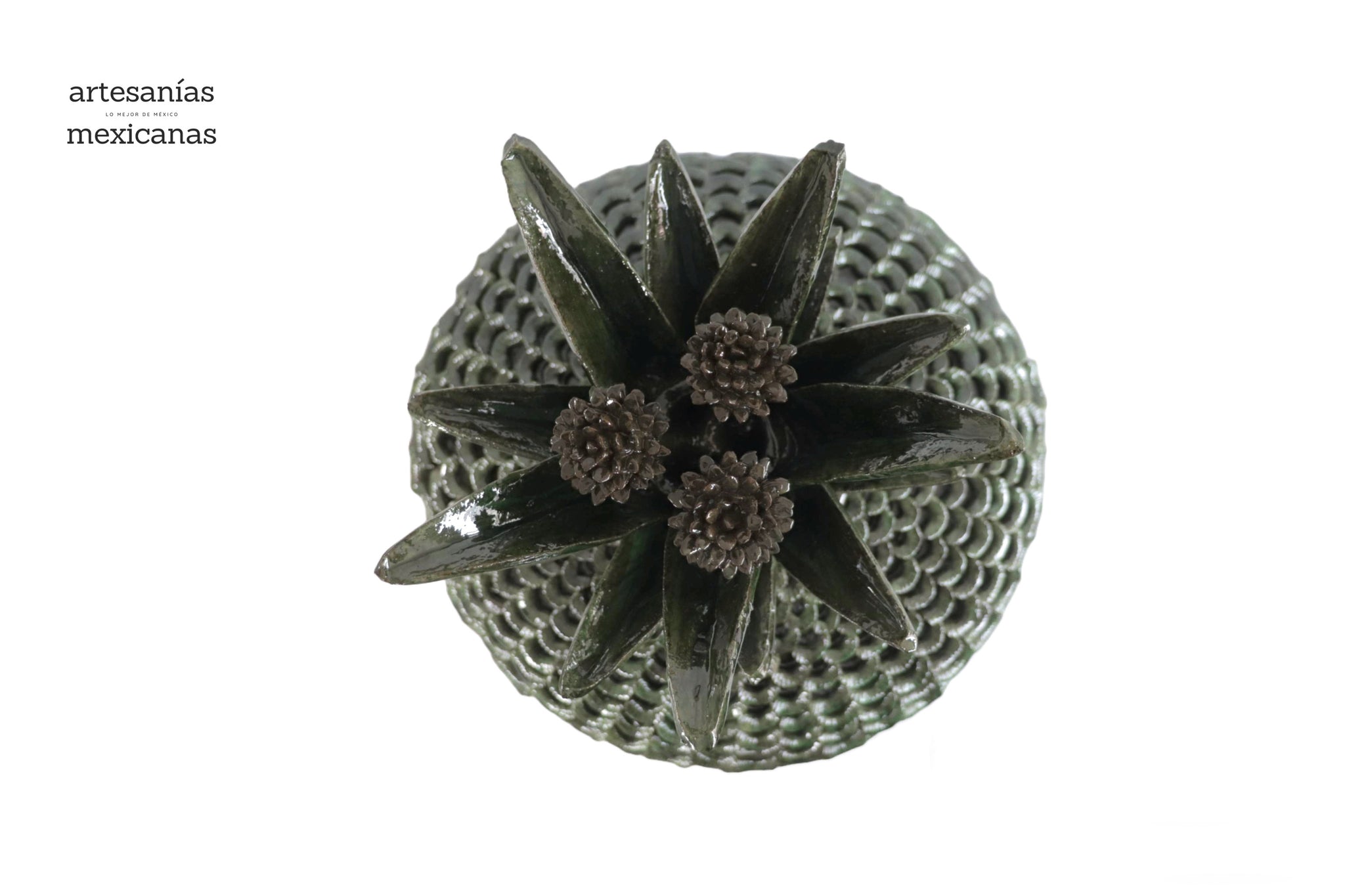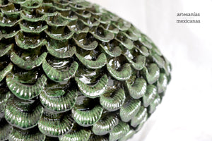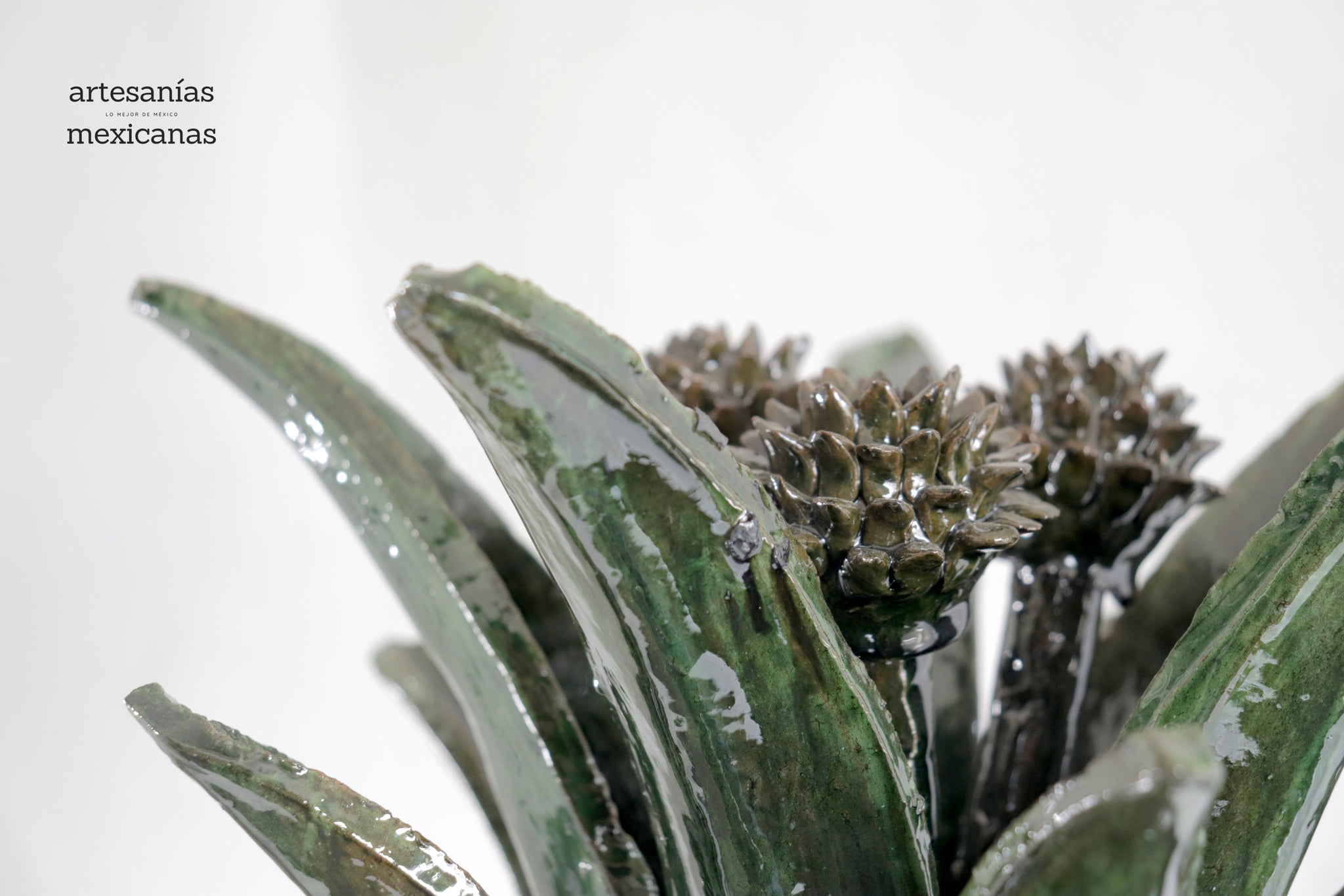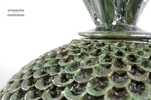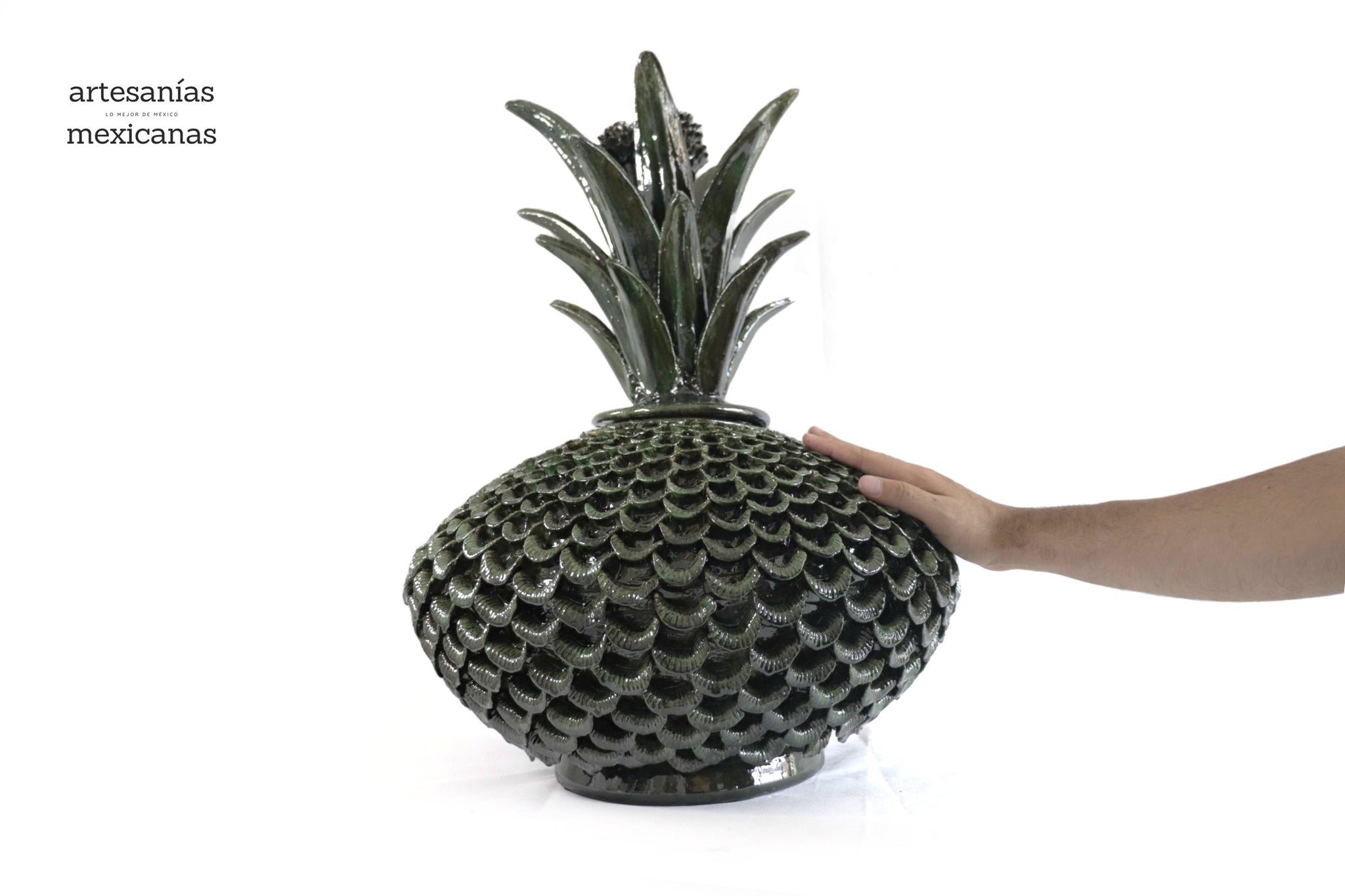 Ideal como elemento decorativo o pieza coleccionable, esta Piña Verde se adapta a cualquier ambiente, aportando un toque auténtico y cultural. Su presencia en el hogar o en una colección de cerámica artesanal celebra la riqueza y belleza de la alfarería mexicana, destacando la maestría de los artesanos y el valor de la tradición en cada pieza.