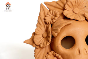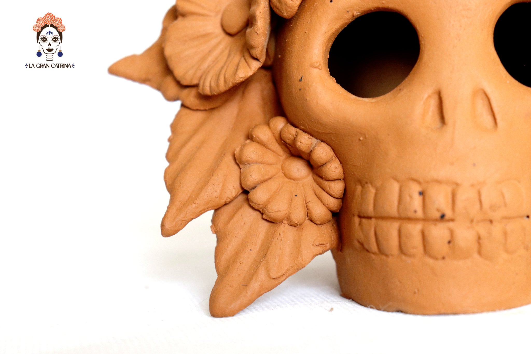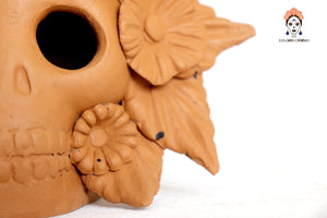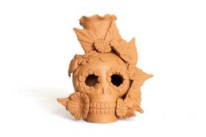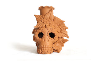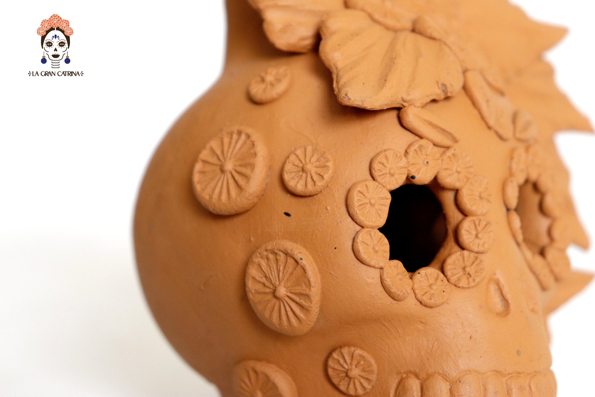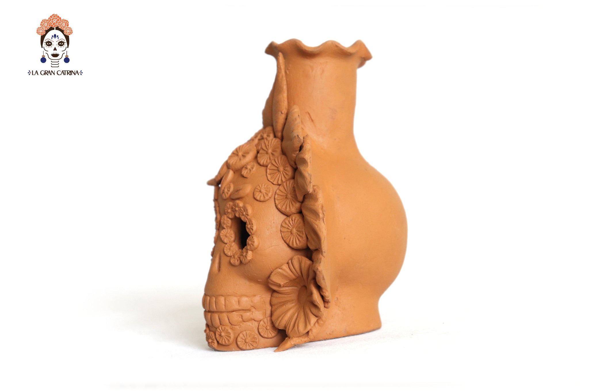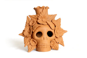 Candelero de calavera estilo Catrina hecha por artesanos especializados en el arte en barro de la comunidad de Capula, Morelia, Michoacán.
