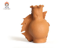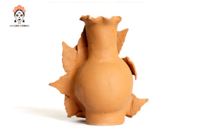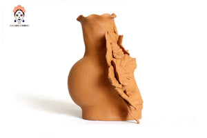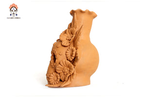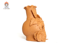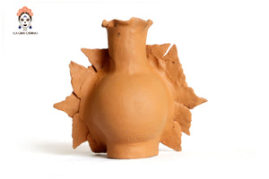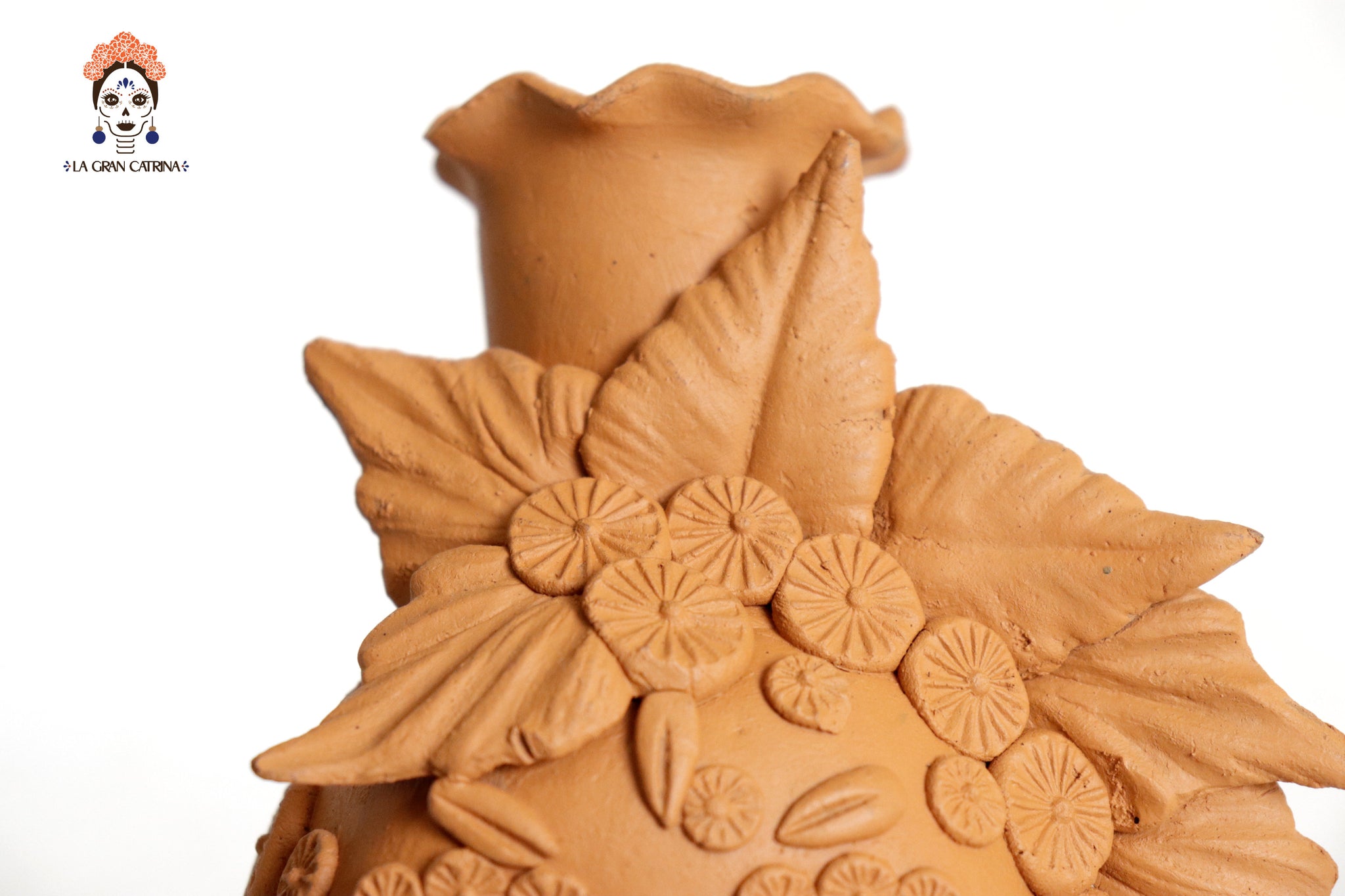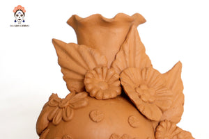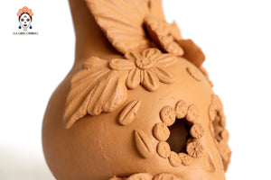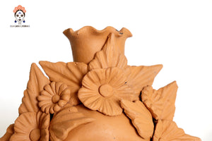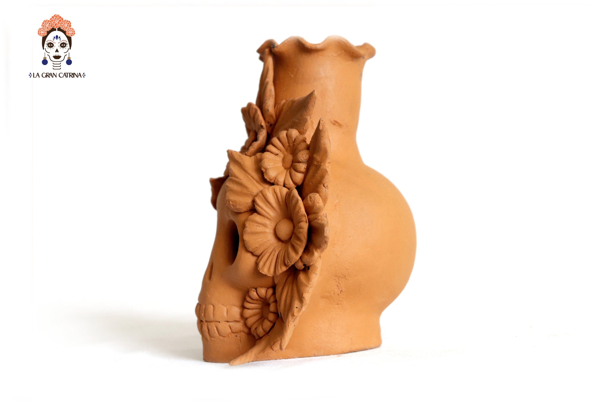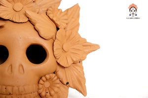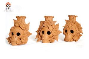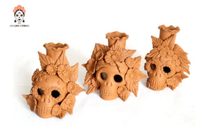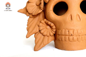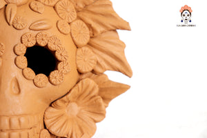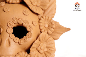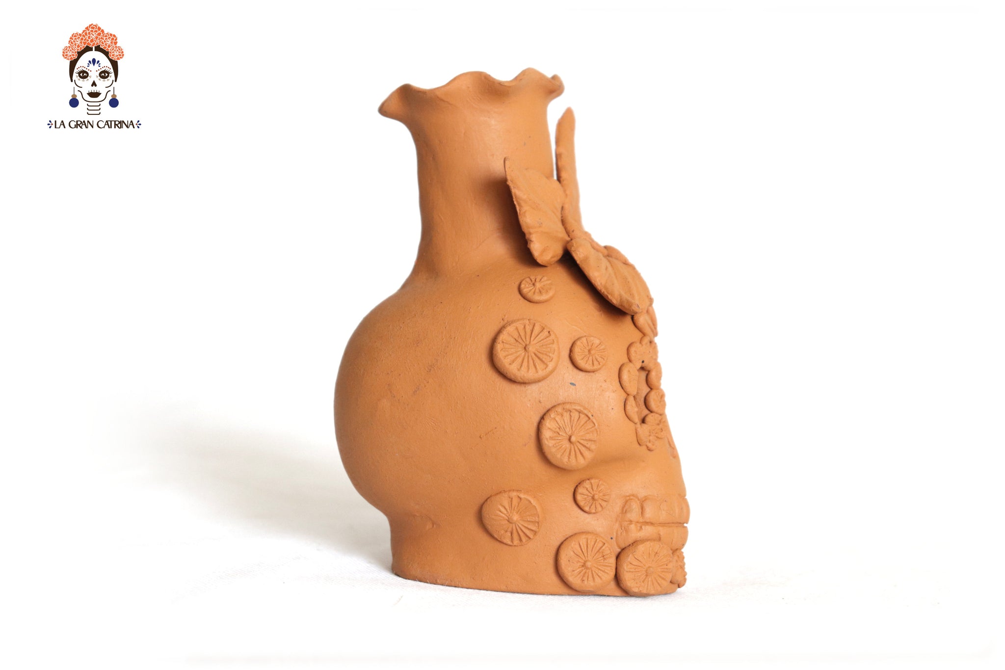 Candelero de calavera estilo Catrina hecha por artesanos especializados en el arte en barro de la comunidad de Capula, Morelia, Michoacán.