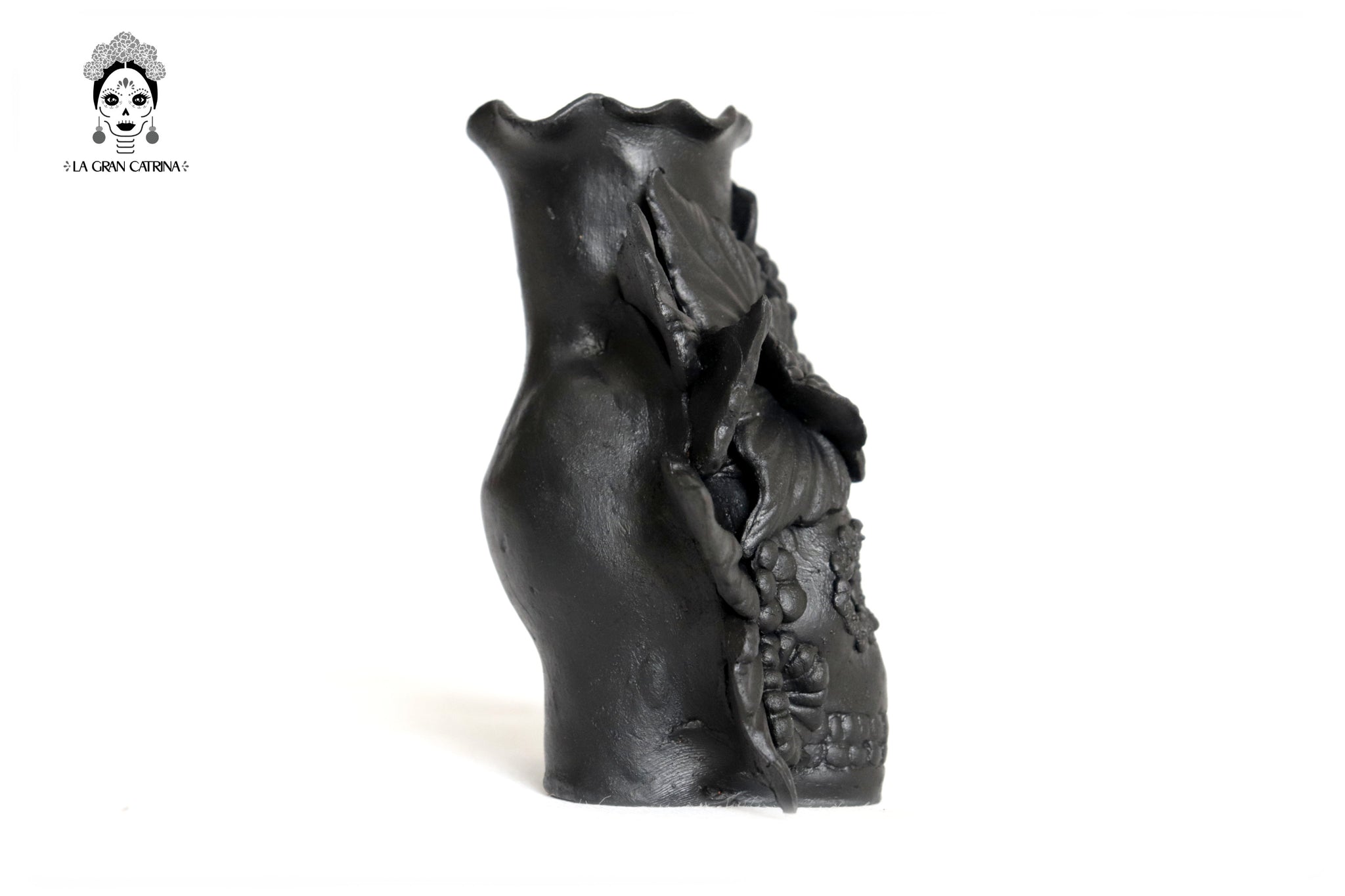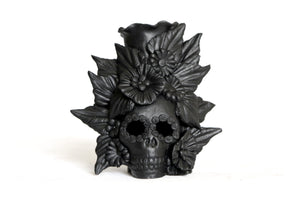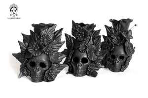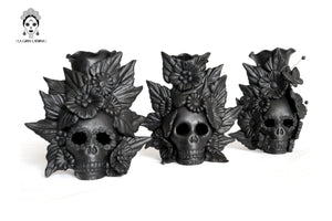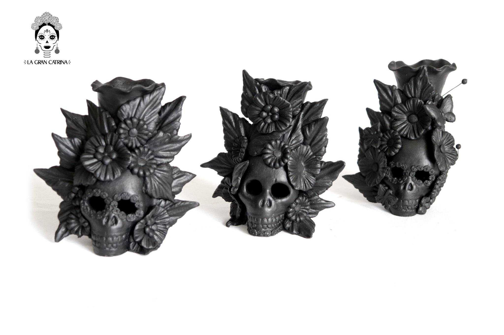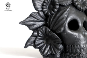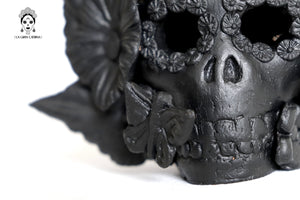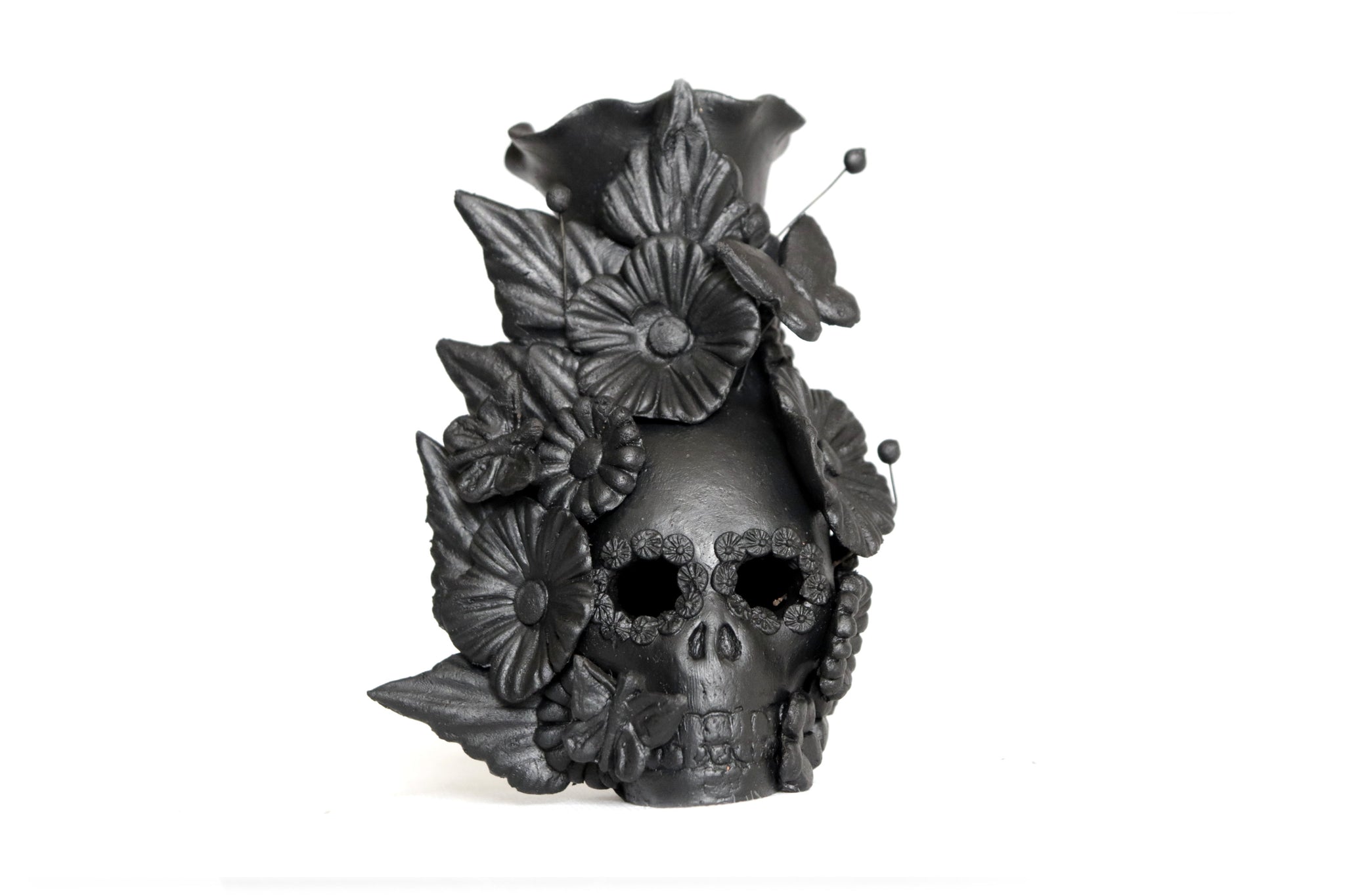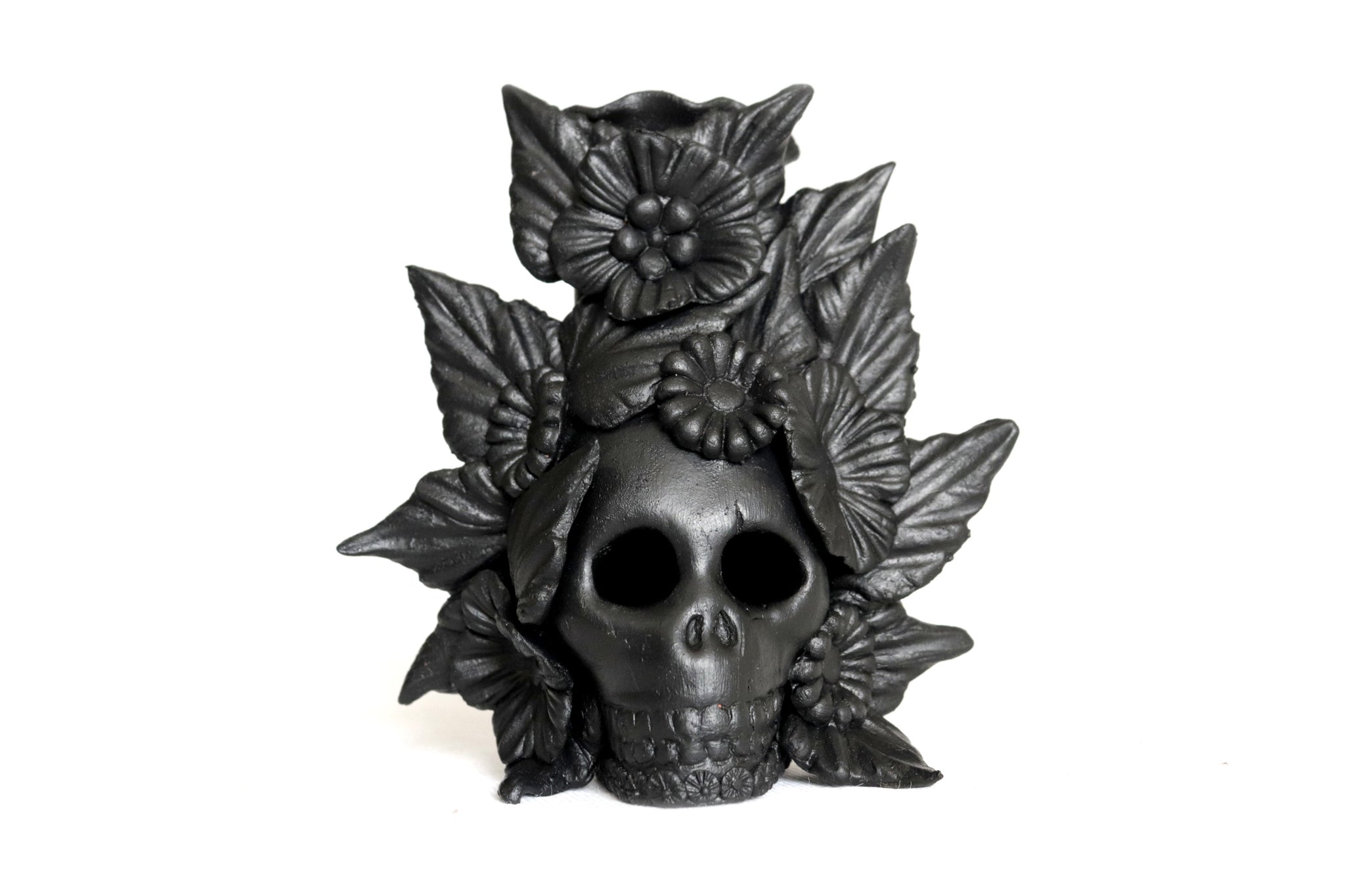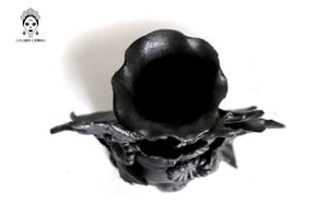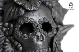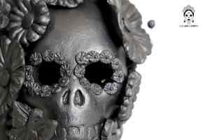 Candelero de calavera estilo Catrina hecha por artesanos especializados en el arte en barro de la comunidad de Capula, Morelia, Michoacán.
