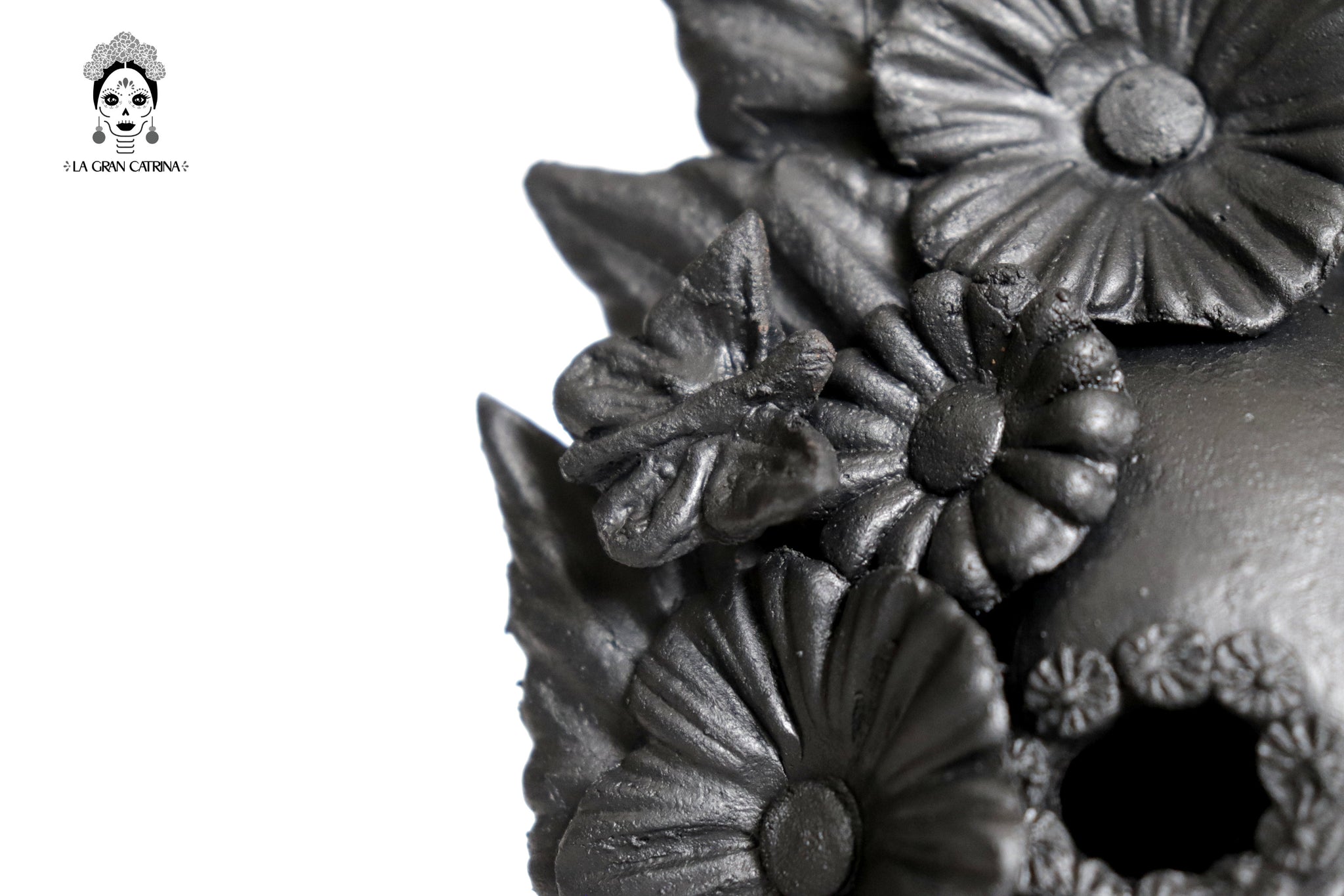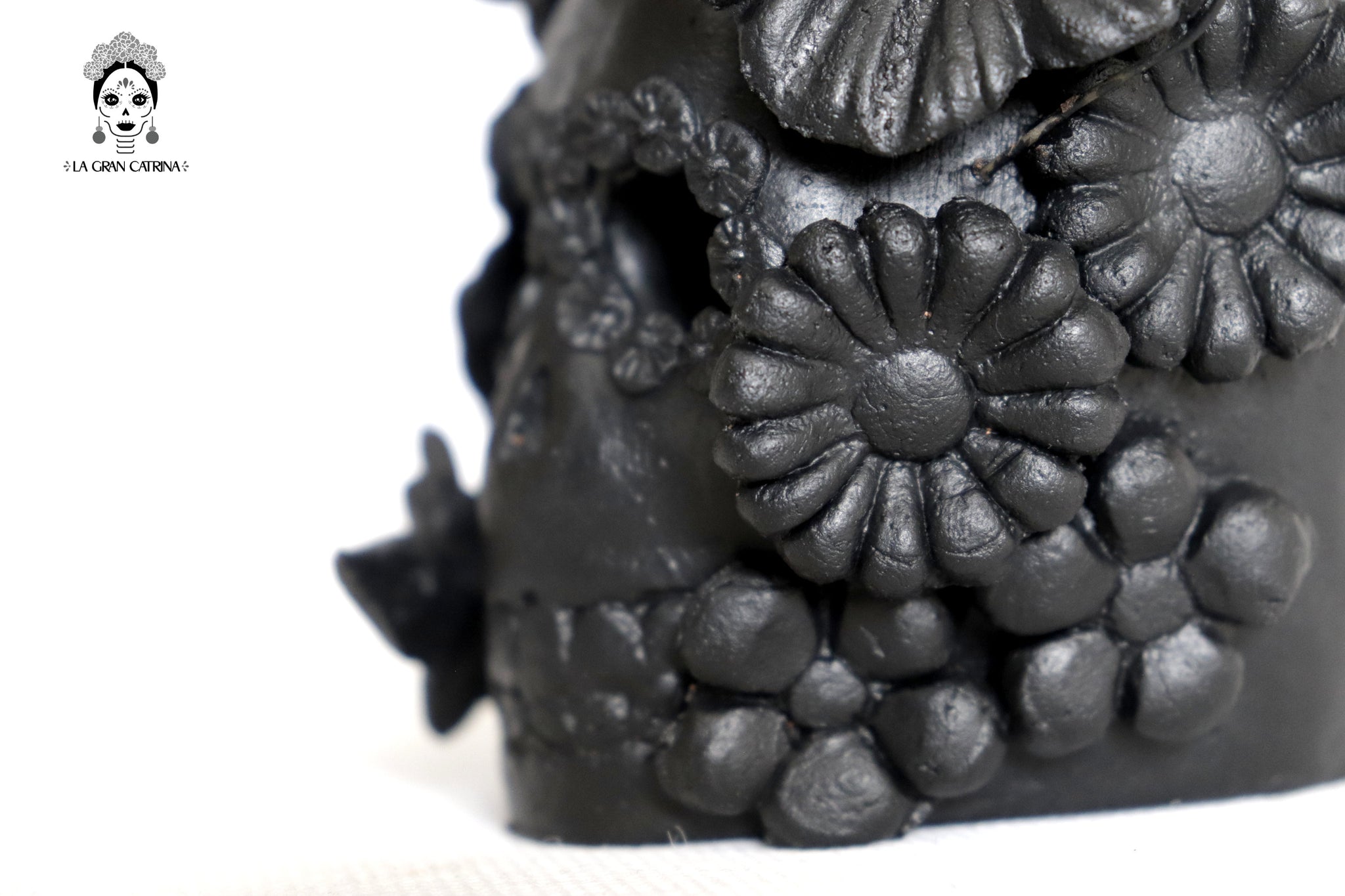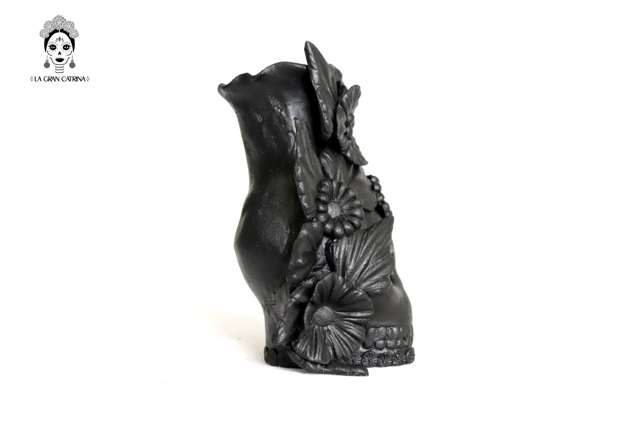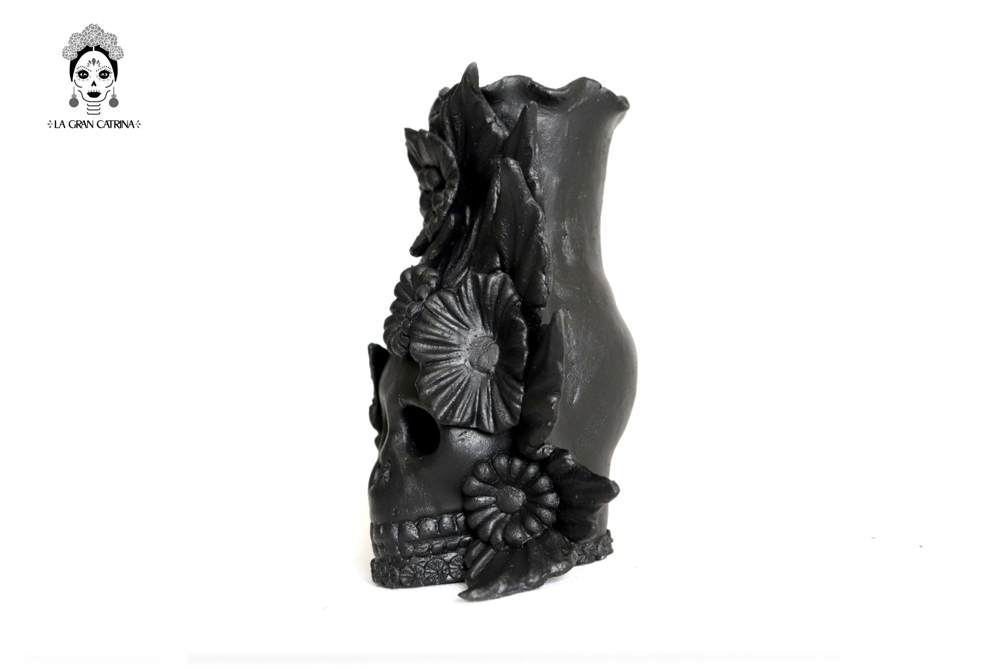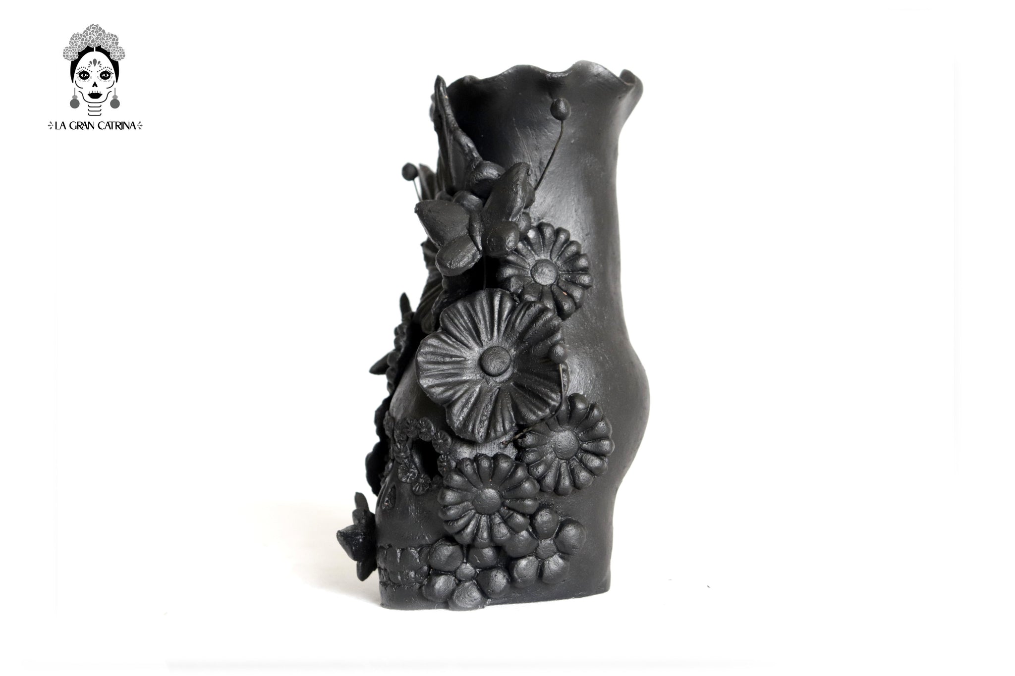 Candelero de calavera estilo Catrina hecha por artesanos especializados en el arte en barro de la comunidad de Capula, Morelia, Michoacán.