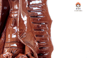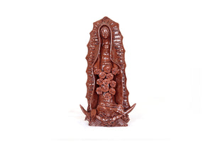 Obra artesanal única realizada en barro cocido por manos maestras de Metepec, Estado de México. Esta escultura representa a la Virgen de Guadalupe con un rostro sereno y elegante, rodeada por un aura de rosas finamente modeladas y sostenidas con delicados alambres de metal. Cada rosa simboliza el milagro y la devoción guadalupana.