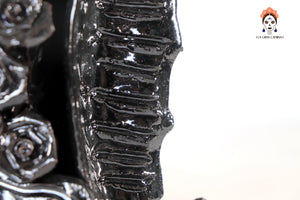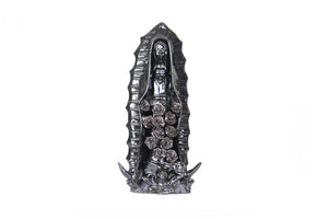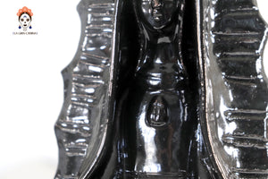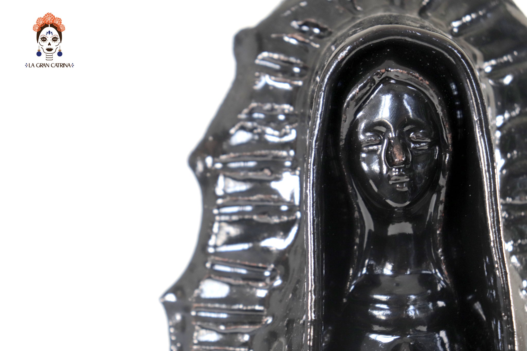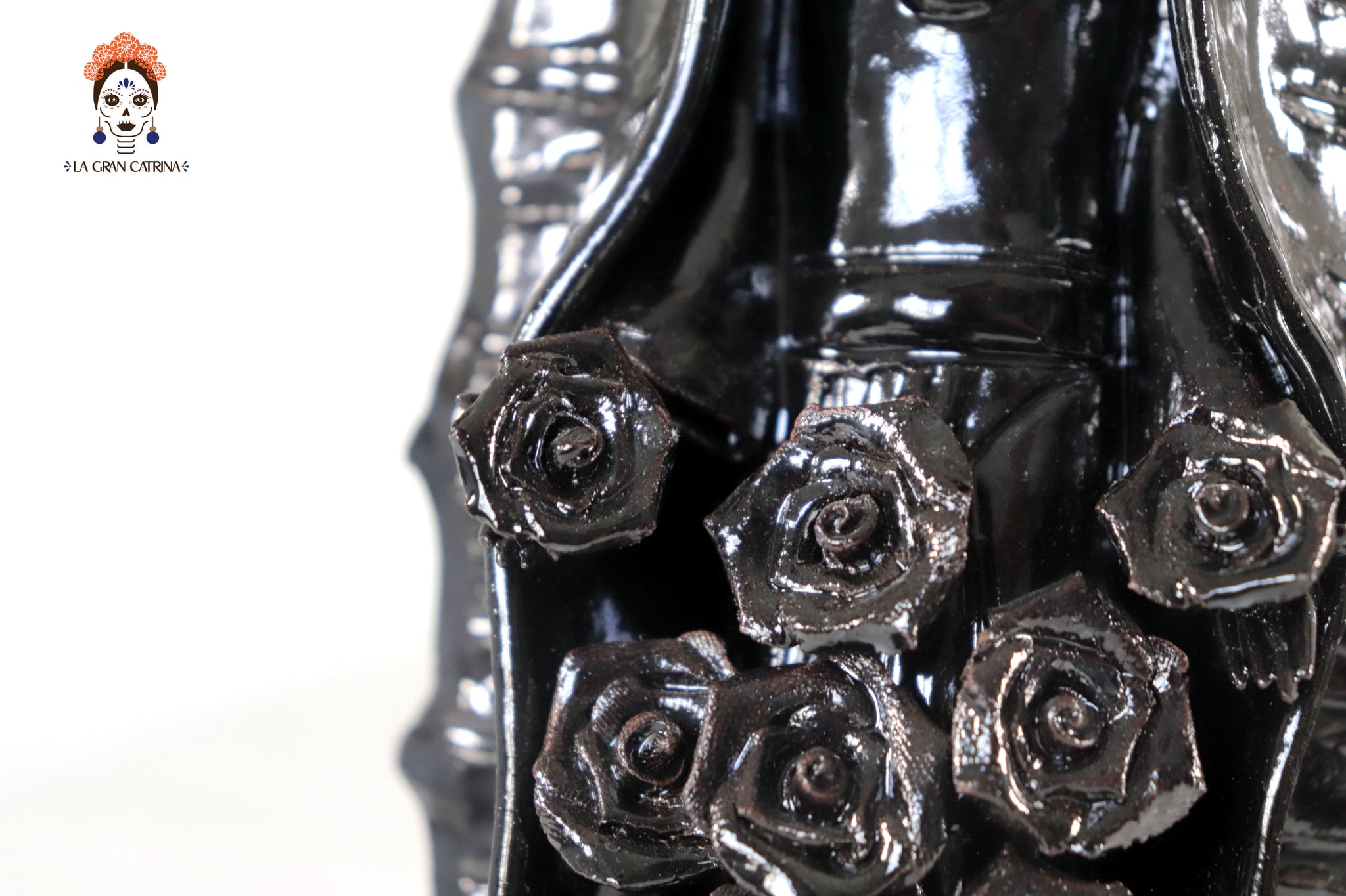 Obra artesanal única realizada en barro cocido por manos maestras de Metepec, Estado de México. Esta escultura representa a la Virgen de Guadalupe con un rostro sereno y elegante, rodeada por un aura de rosas finamente modeladas y sostenidas con delicados alambres de metal. Cada rosa simboliza el milagro y la devoción guadalupana.